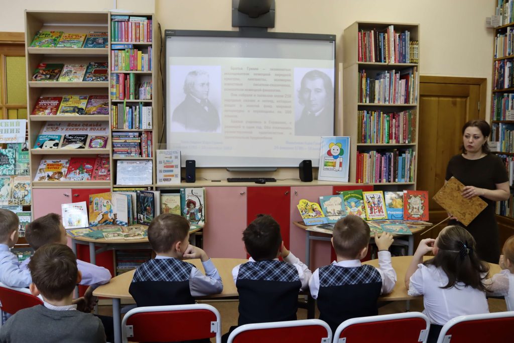 Используя слайд-презентацию и демонстрируя книги, библиотекарь рассказала школьникам, что Якоб и Вильгельм Гримм собирали и исследовали немецкий фольклор, бережно обрабатывали народные сказки, сохраняя их мудрость и обаяние.