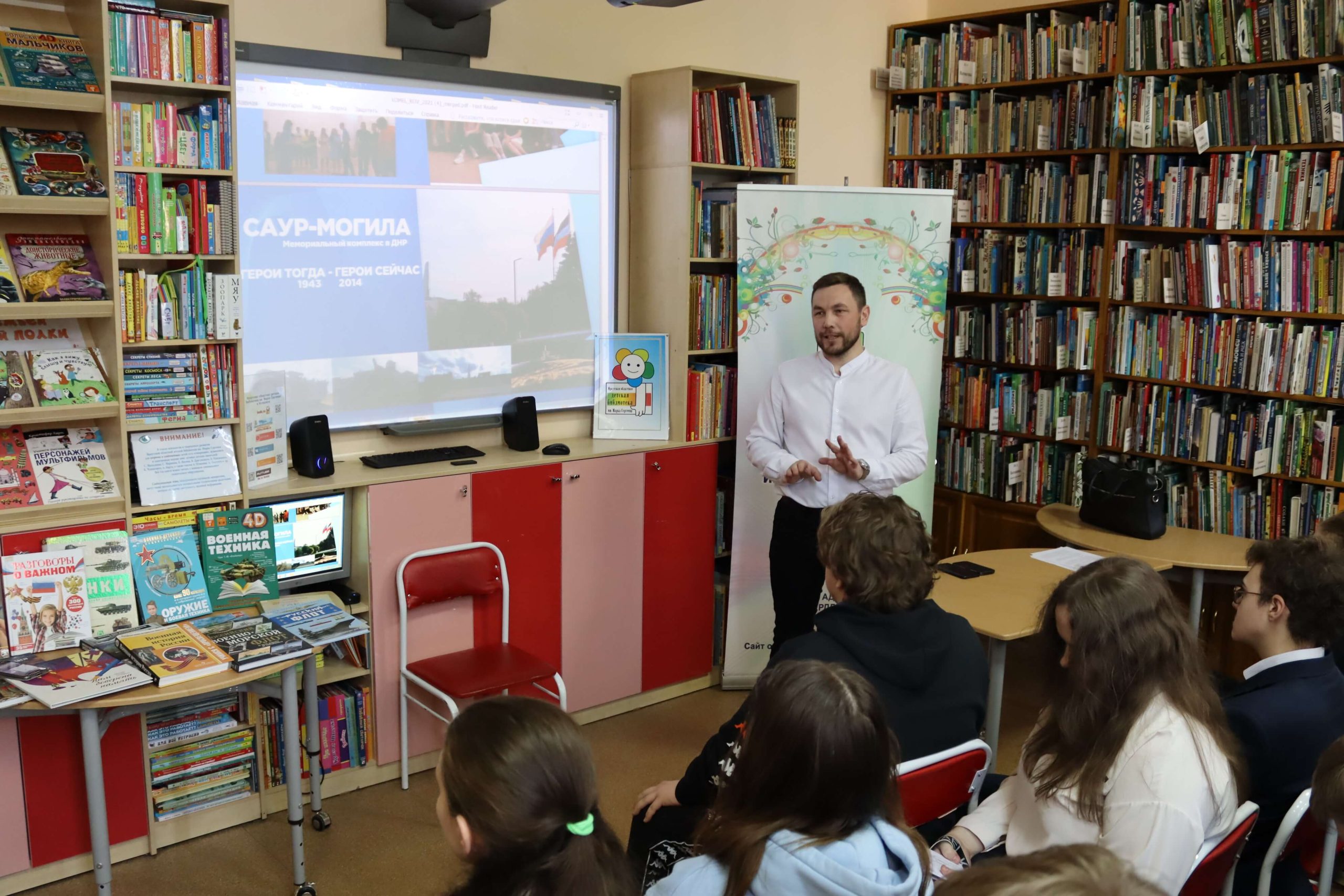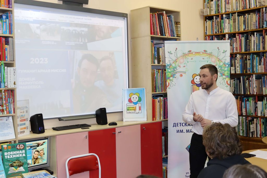 Рассказ гостя библиотеки перемежался показом небольших видеороликов, снятых во время поездок – это интервью с молодыми жителями Донбасса и участниками специальной военной операции. Они рассказывали о своих мечтах, о том, как люди, столкнувшись с трудностями, не падают духом, а готовы оказывать помощь, проявляют лучшие человеческие качества, чувство патриотизма и любовь к родине.