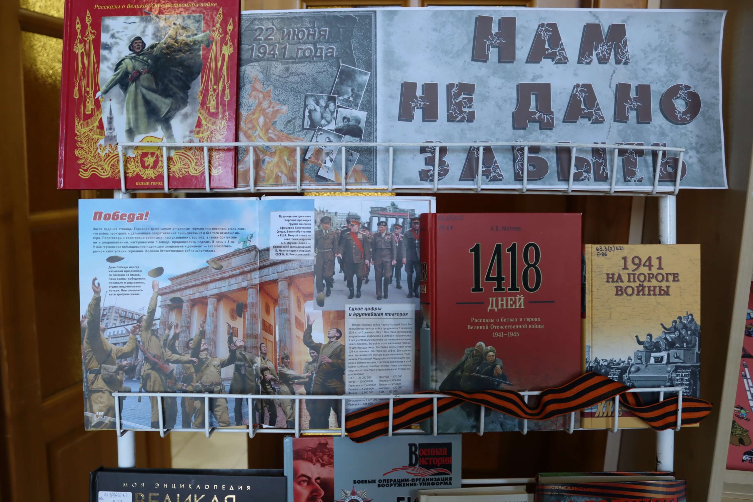 Книжно-иллюстративная выставка «Нам не дано забыть» (12+) доступна для посетителей в читальном зале библиотеки. В экспозиции представлена научно-популярная, энциклопедическая и художественная литература, знакомящая читателя с реальными событиями истории Великой Отечественной войны. Книги рассказывают о внезапном нападении немецко-фашистских захватчиков на Советский Союз, о начале войны, о подвигах, героизме и самопожертвовании советских солдат и офицеров, о героях тыла, которые своим трудом и мужеством помогали фронту, о беспримерном подвиге всего народа нашей страны, наших предков. Это книги Валентина Рунова «1941. На пороге войны», Константина Галеева «Герои Великой Отечественной войны», Вячеслава Ликсо «Вторая мировая война» и др.