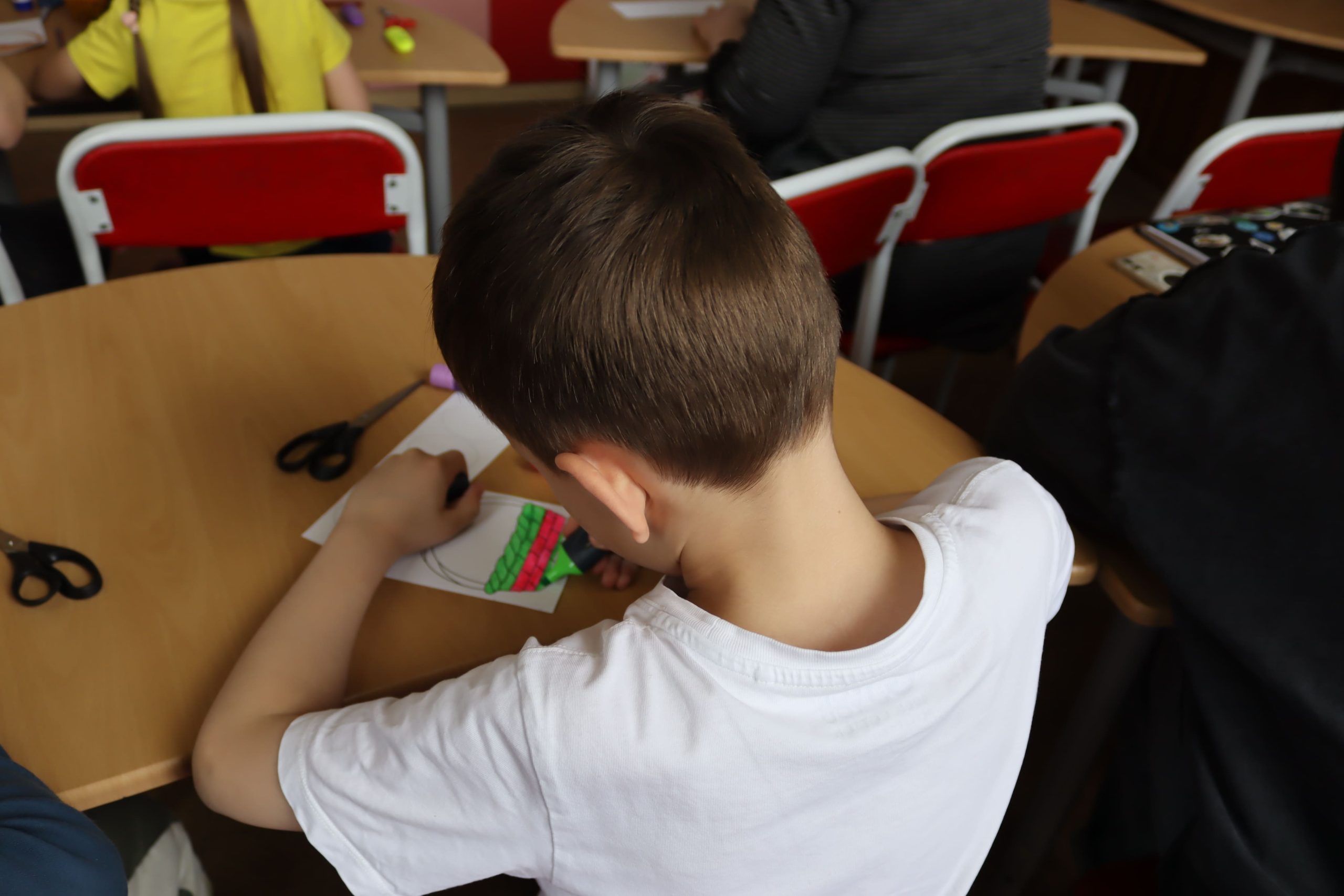 Дети с удовольствием принялись за работу. Каждый выбирал на своё усмотрение цветовую гамму для поделки. По шаблонам ребята самостоятельно вырезали из цветной бумаги заготовки, а затем всё это старательно склеивали и раскрашивали.