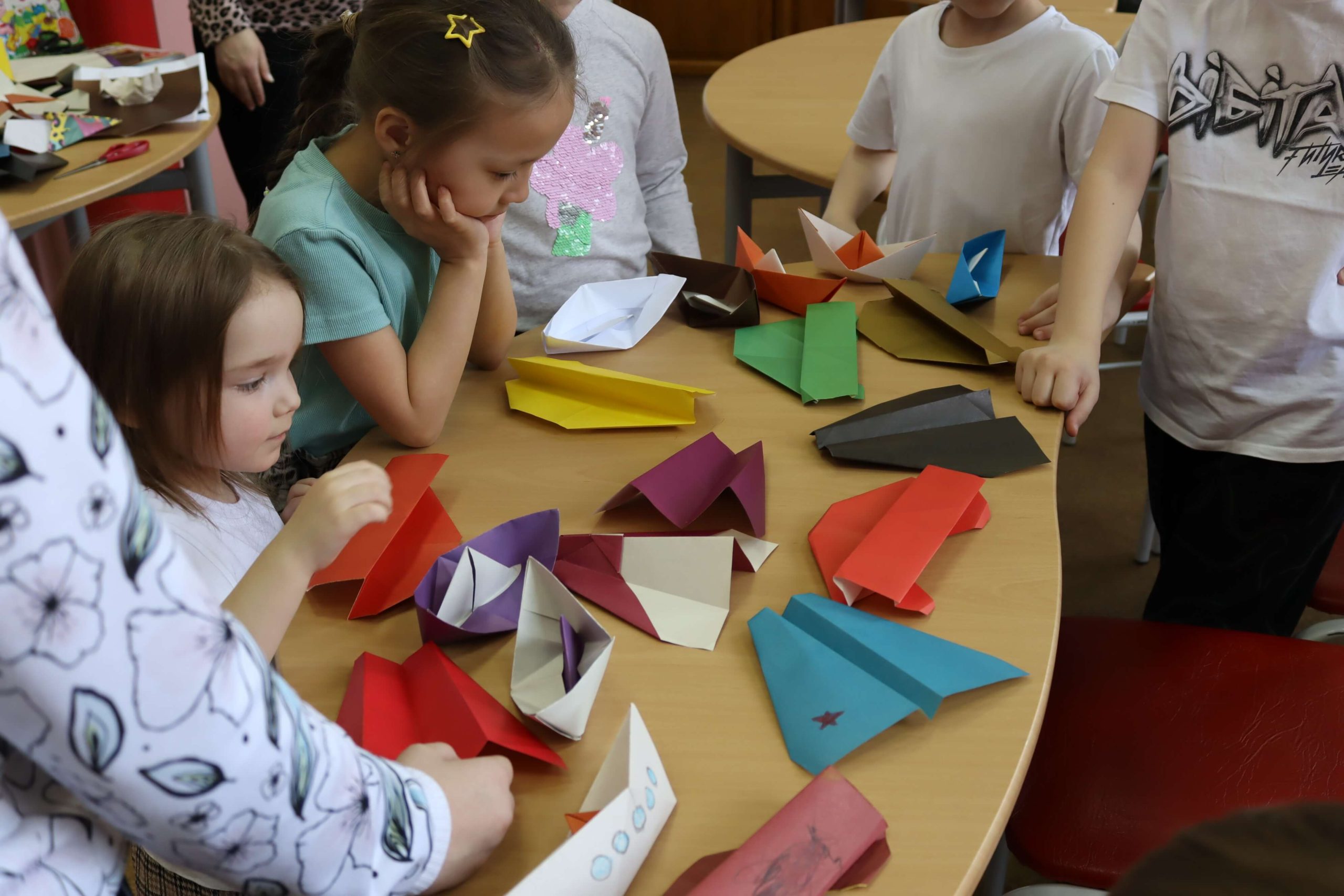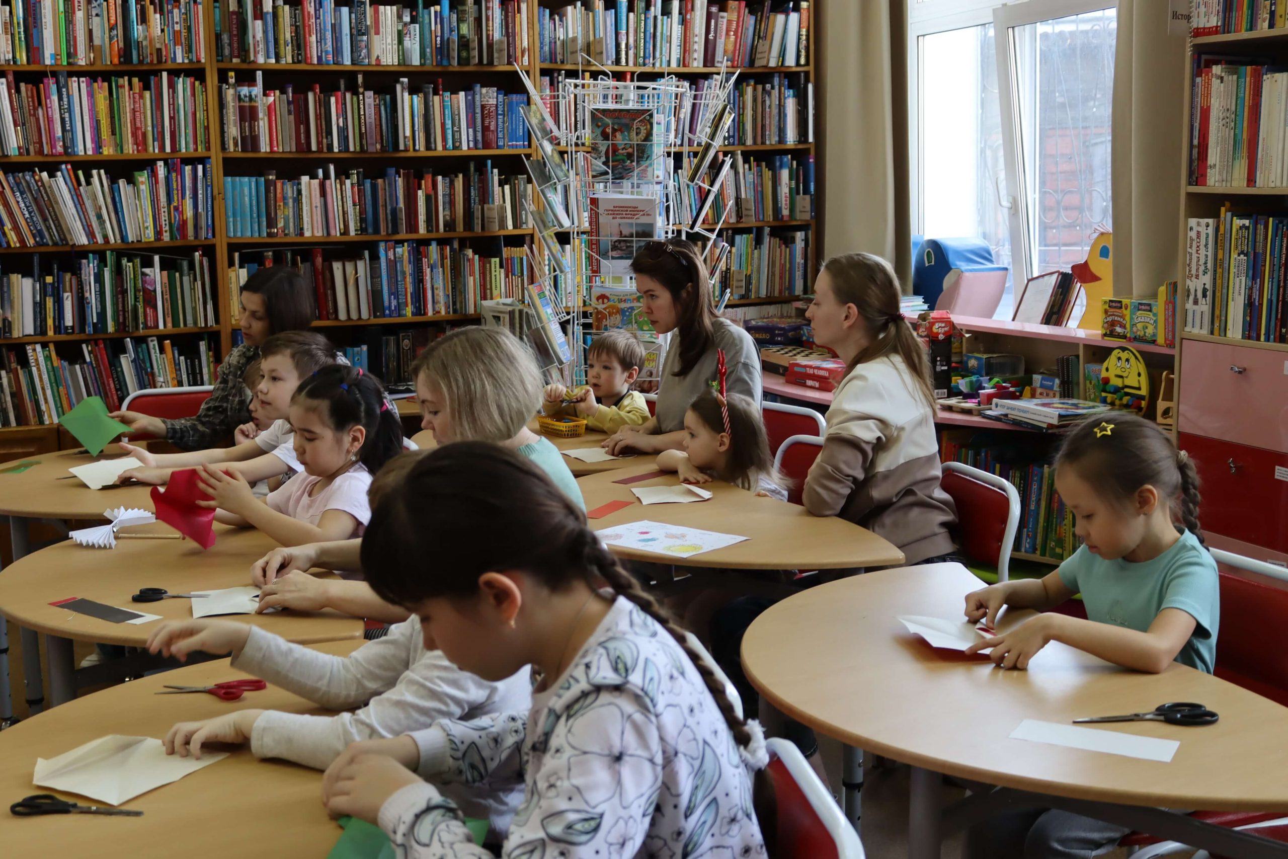 Под руководством библиотекаря дети с увлечением сами или с помощью родителей учились аккуратно складывать из цветной бумаги самолётик, кораблик и машинку. В итоге у каждого получились разноцветные бумажные игрушки.