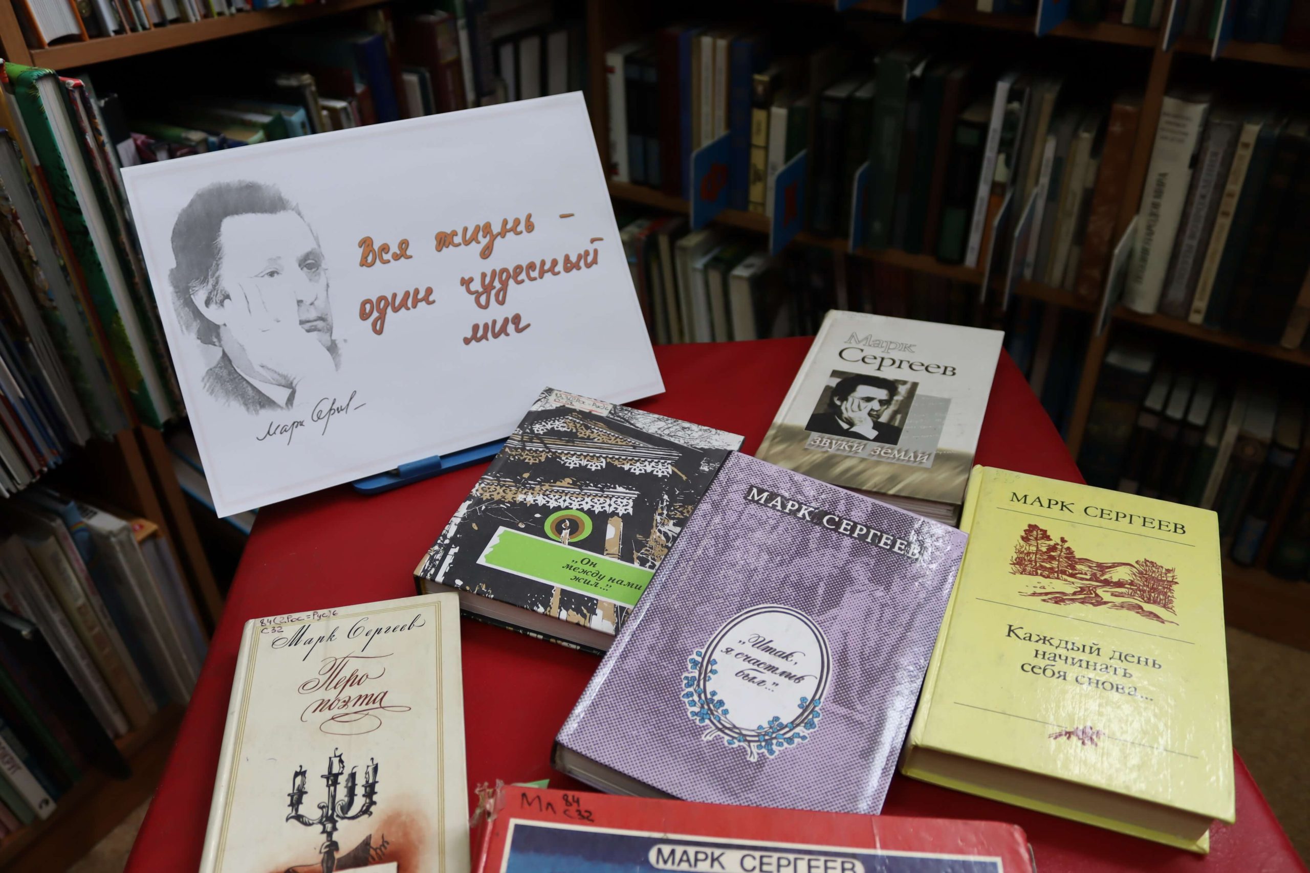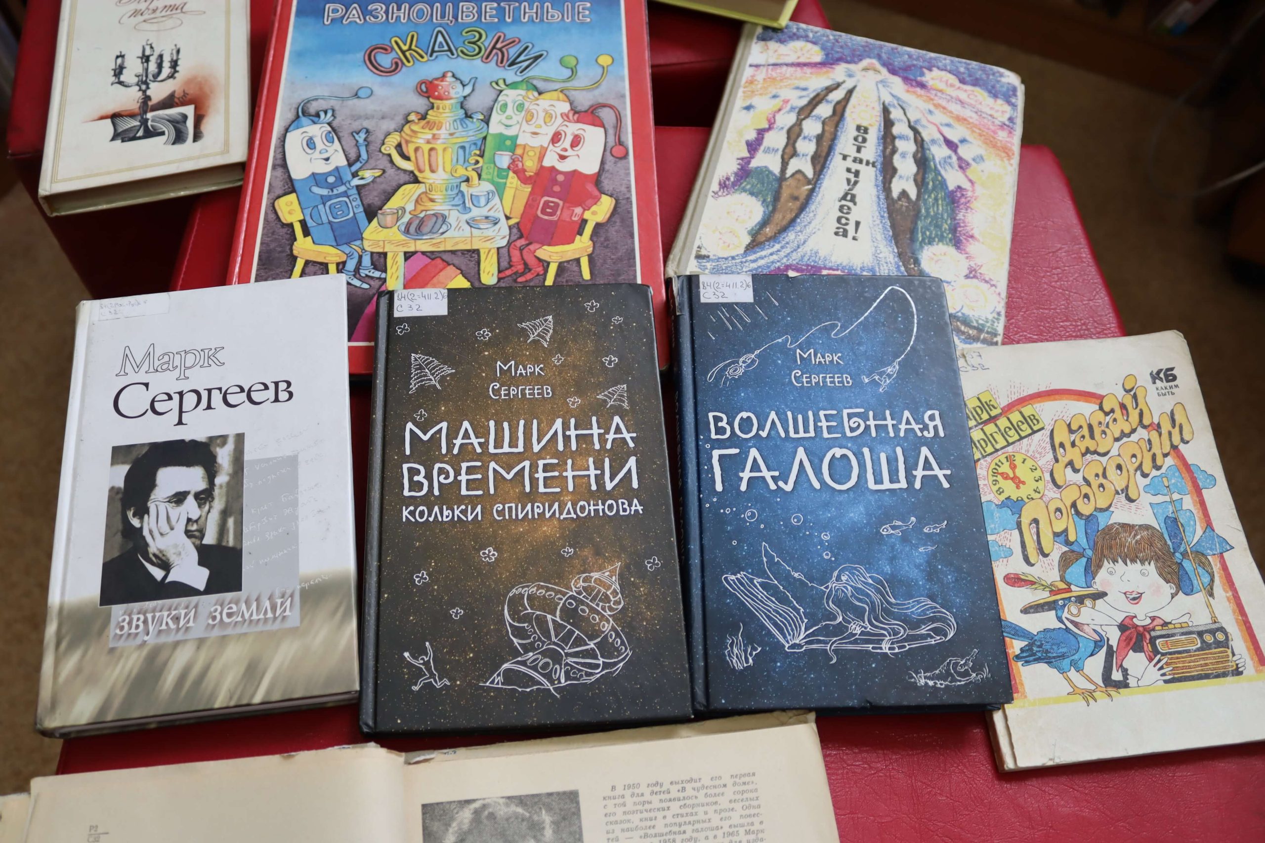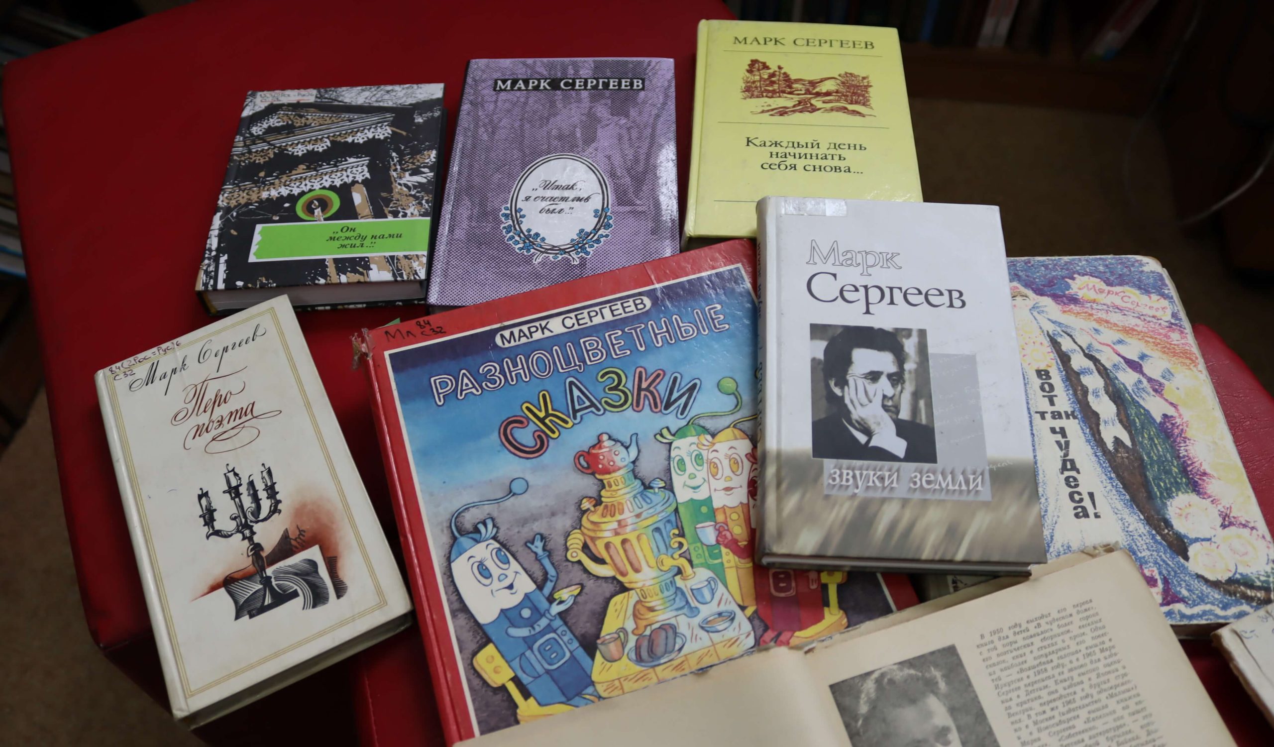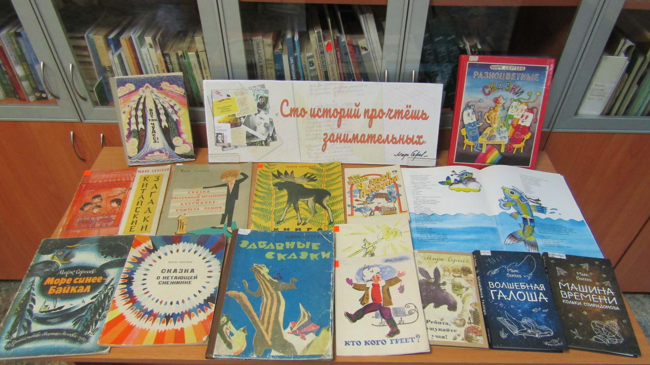 На книжно-иллюстративной выставке «Сто историй прочтёшь занимательных…» в отделе краеведения и библиографии (ул. Пискунова, 50) представлены книги писателя для детей. Марк Сергеев написал для юных читателей замечательные стихи, сказки, волшебные и фантастические повести. Кроме того, писатель придумал для ребят загадки в стихах, которые были опубликованы в его книжках, а также на страницах детского журнала «Сибирячок».
