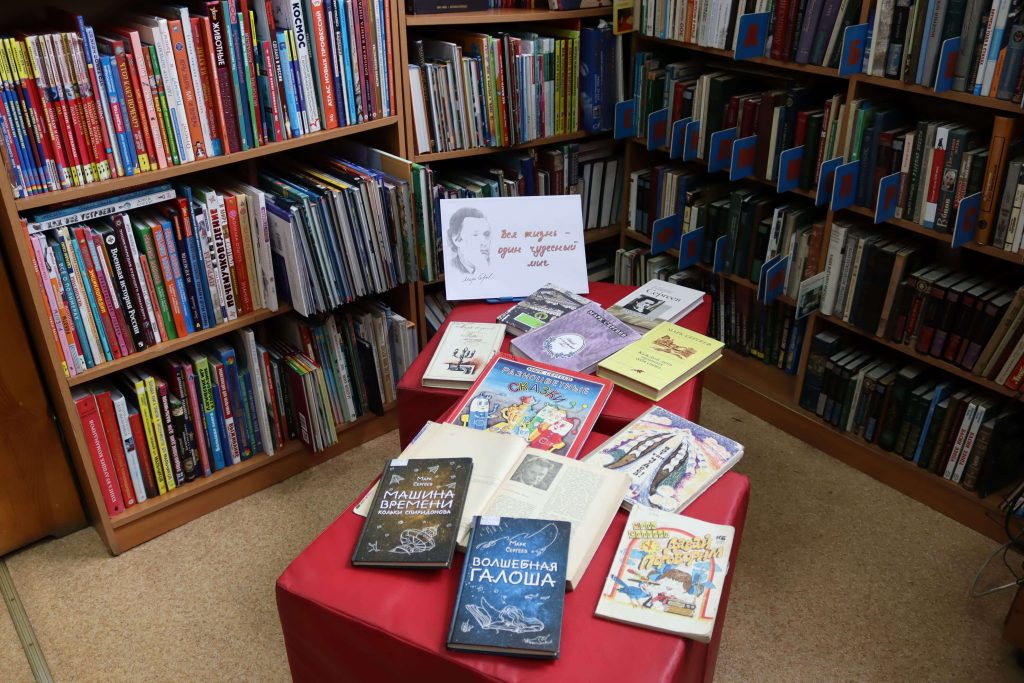 Читатели найдут на выставке удивительные истории в сборнике «Разноцветные сказки», сказки «Глоток океана», «Сказка о нетающей снежинке», книги «Ребята, пощупайте уши», «Звездочет», «Беглецы», «Книга веселого дятла», фантастические повести «Машина времени Кольки Спиридонова», «Волшебная галоша» и другие.