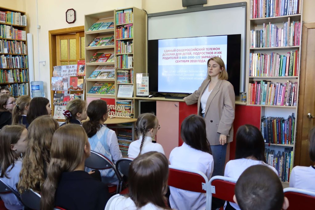 Елена Черентаева рассказала школьникам об истории создания и работе Единого общероссийского телефона доверия для детей, подростков и их родителей, который заработал в России 1 сентября 2010 года. Его номер: 8-800-2000-122, короткий с мобильных телефонов: 124. Школьники познакомились с работой службы детского телефона доверия в Иркутской области.