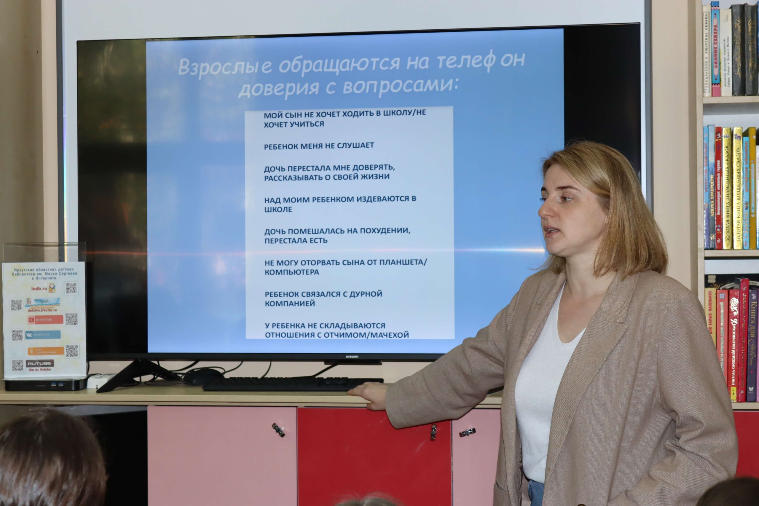 Ежегодно 17 мая в России отмечается Международный день детского телефона доверия. К этой дате в читальном зале Иркутской областной детской библиотеки им. Марка Сергеева прошла встреча детей среднего школьного возраста с Еленой Черентаевой, психологом, представителем службы детского телефона доверия в Иркутской области.