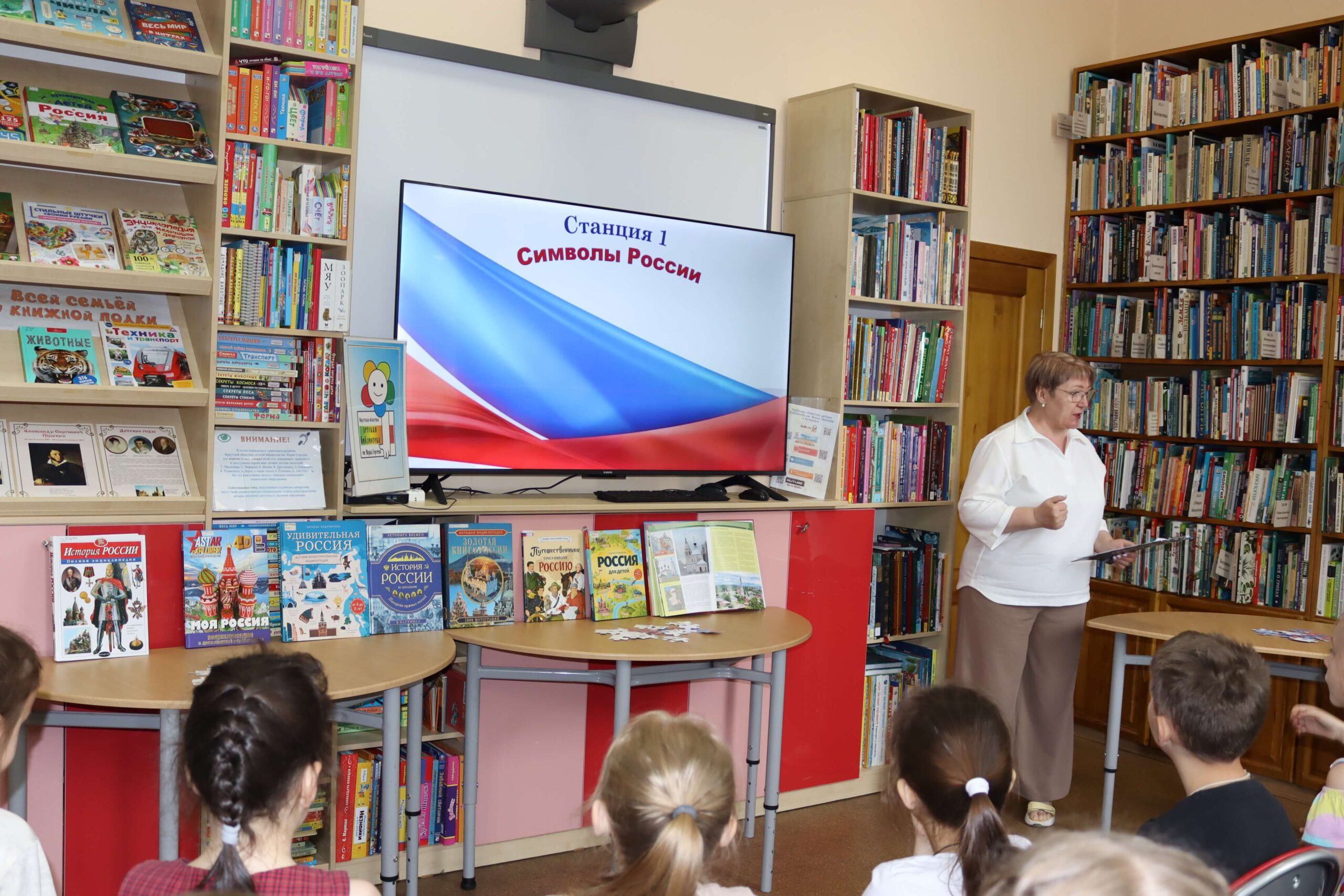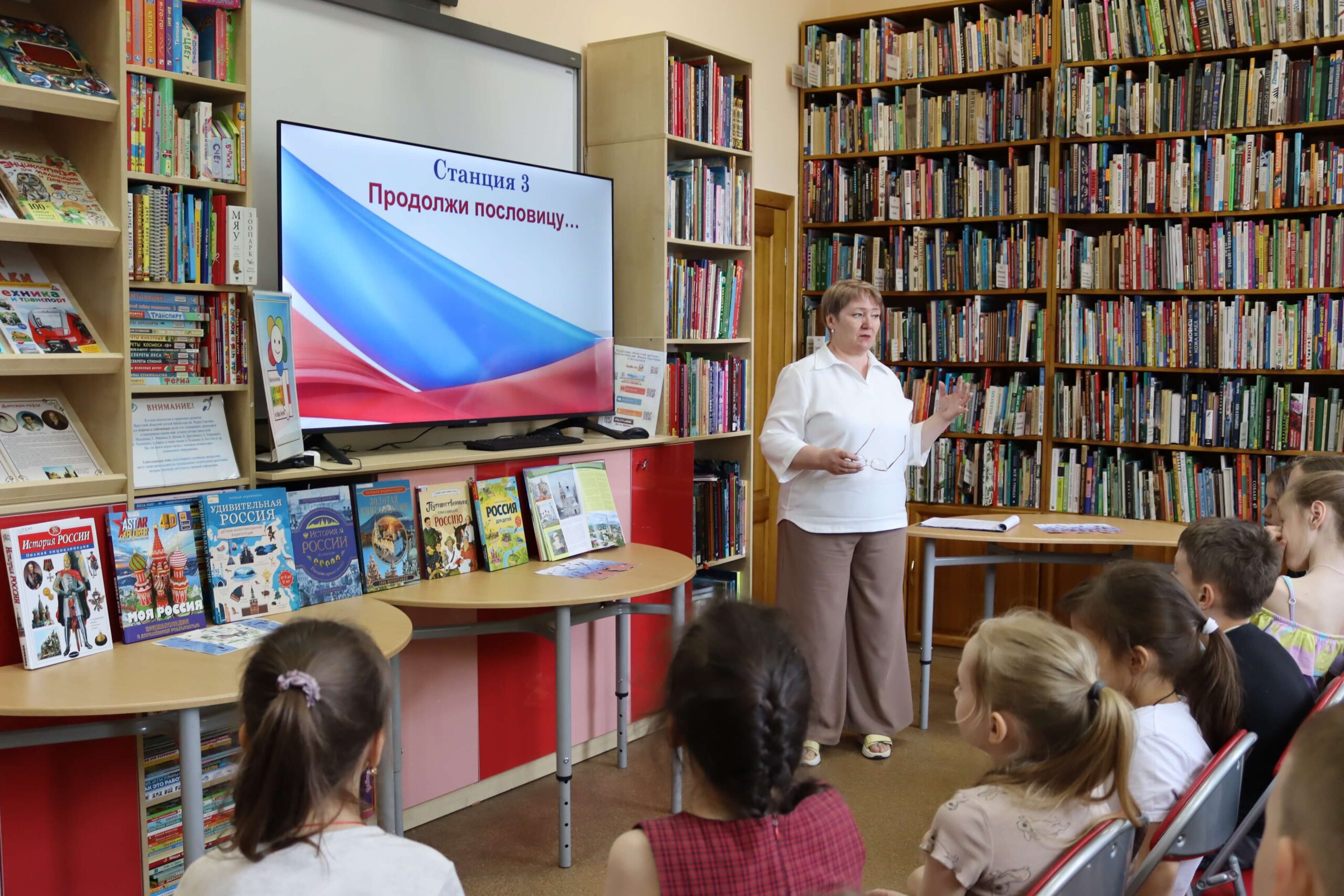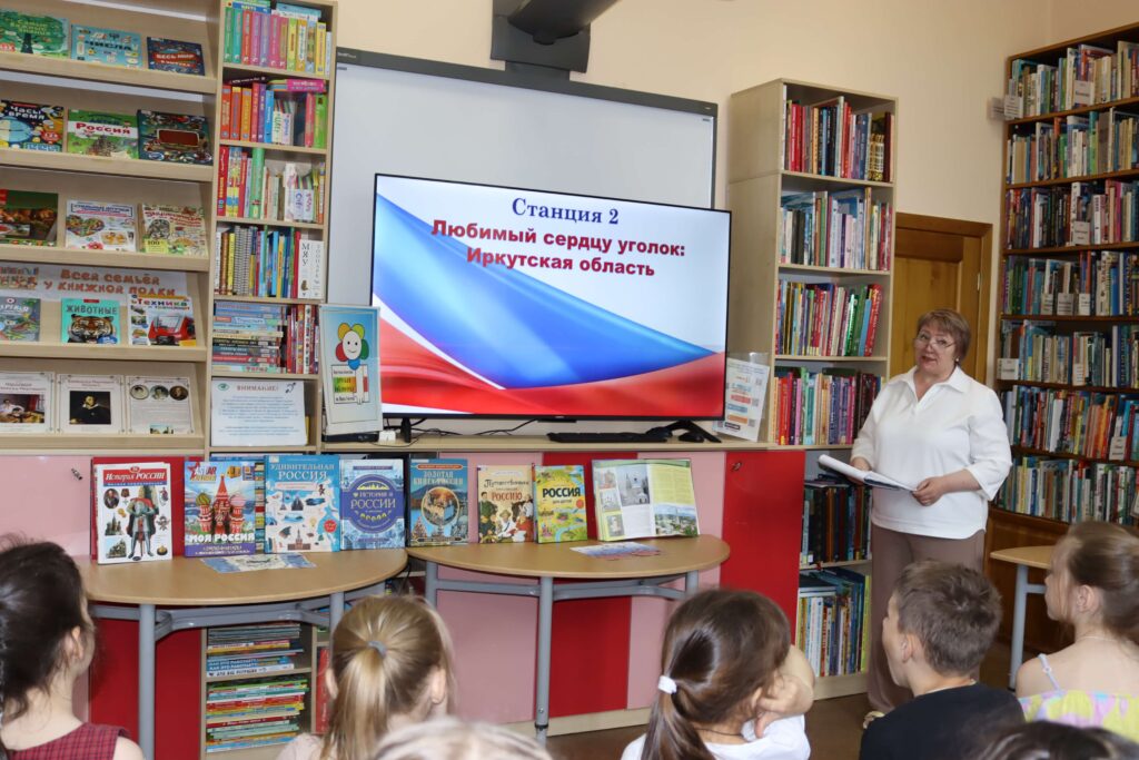 Библиотекарь рассказала школьникам об истории праздника, а затем дети выполнили разные познавательные задания на игровых станциях: «Символы России», «Семь чудес России», «Любимый сердцу уголок: Иркутская область», «Пословицы и поговорки», «Викторина о России».