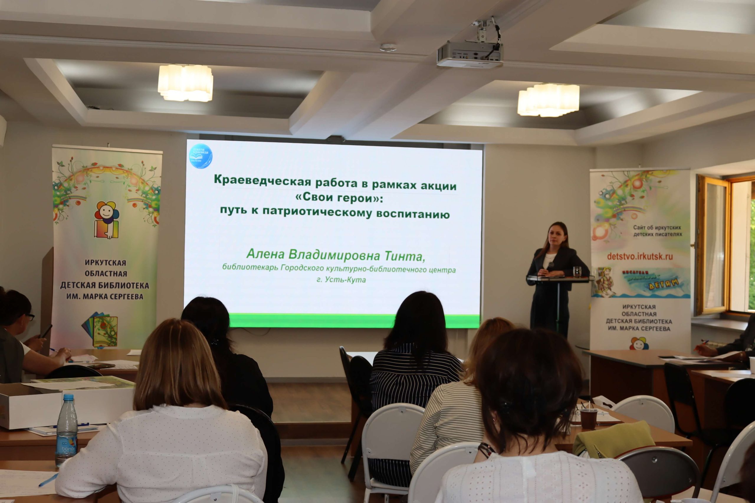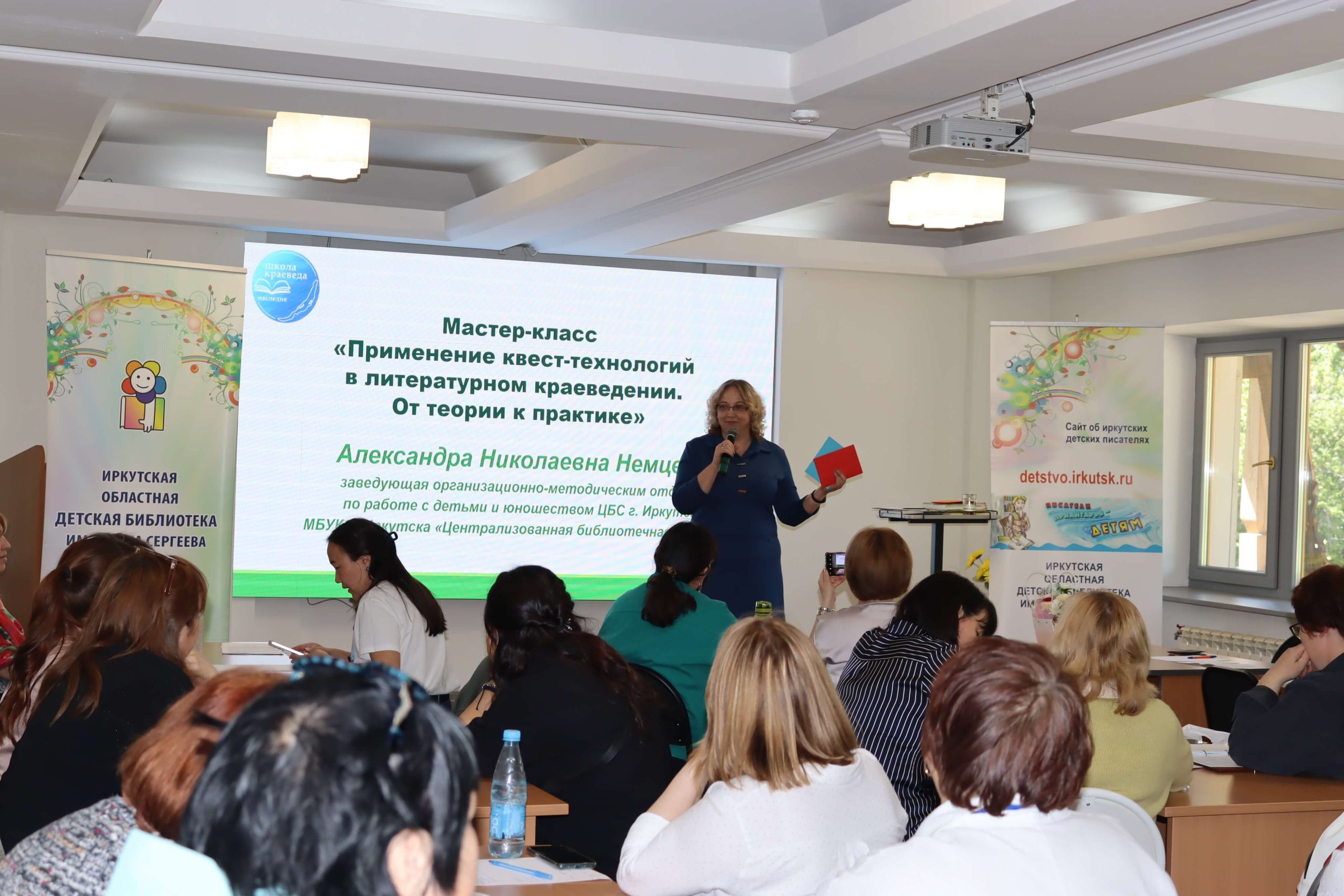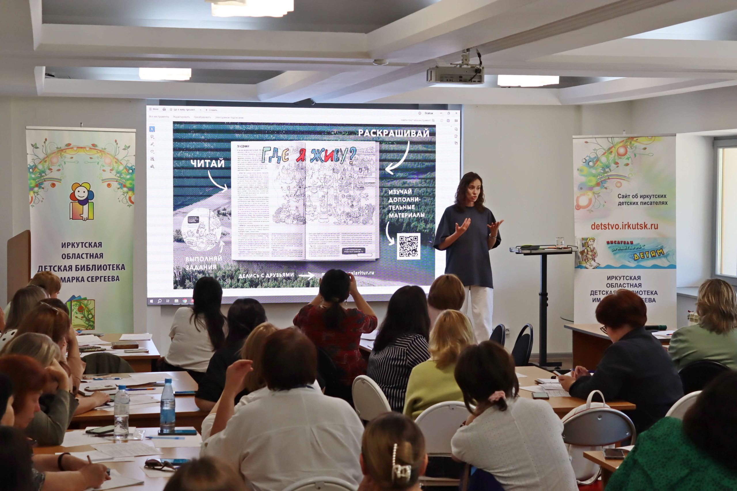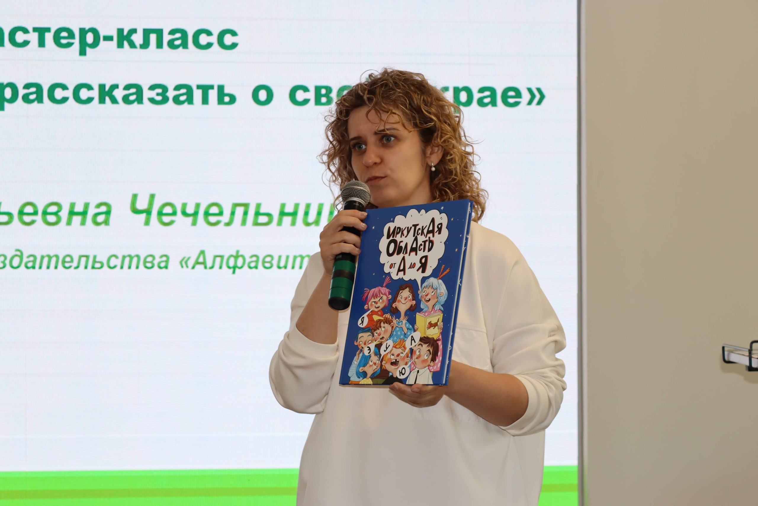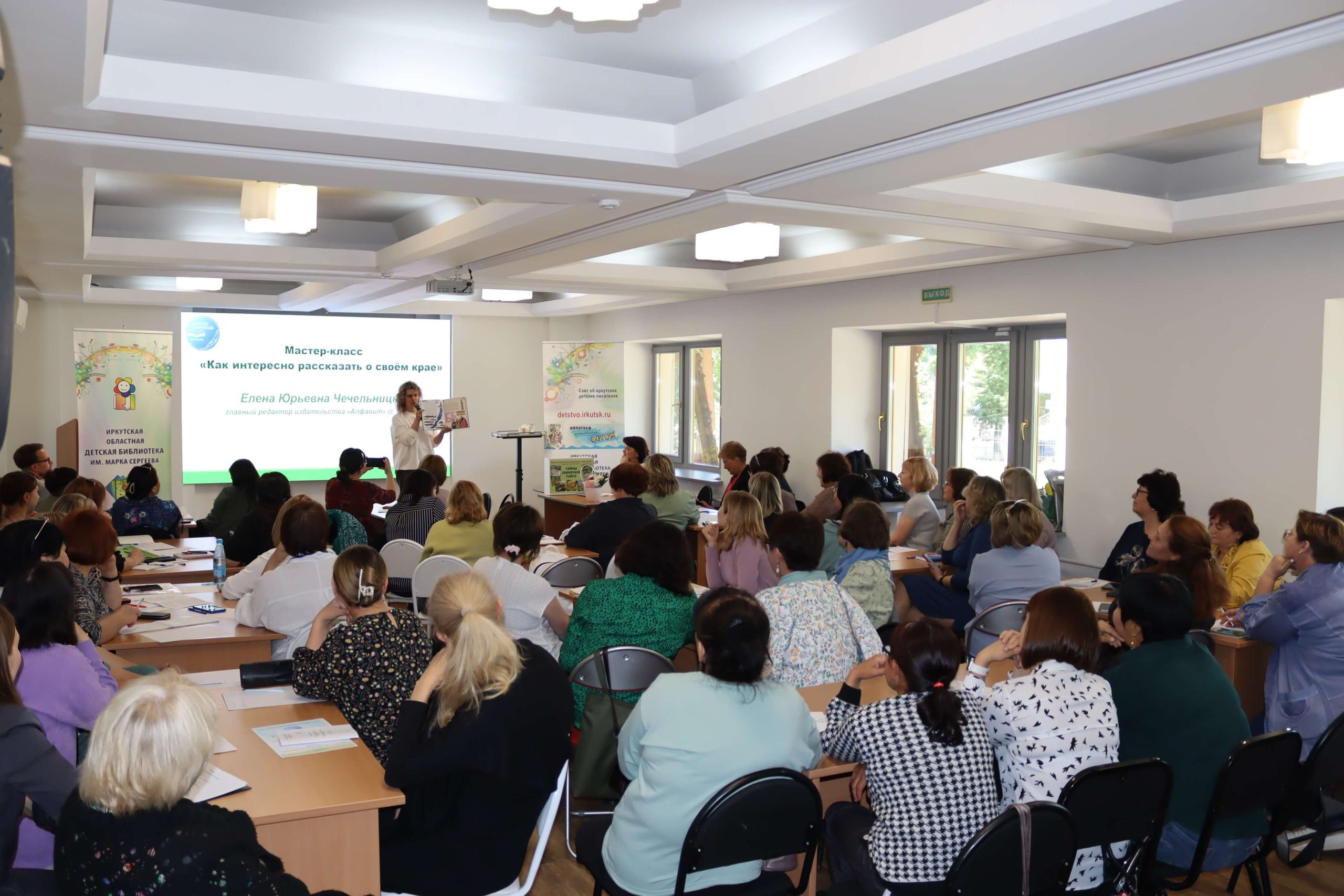Мастер-класс «Как интересно рассказать о своём крае» провела главный редактор иркутского издательства «Алфавит» Елена Чечельницкая, автор детской энциклопедии «Иркутская область от А до Я», в которой собрана краеведческая информация. Во время мастер-класса библиотекари придумывали комиксы, сценарии для видеороликов, тексты и проч.