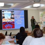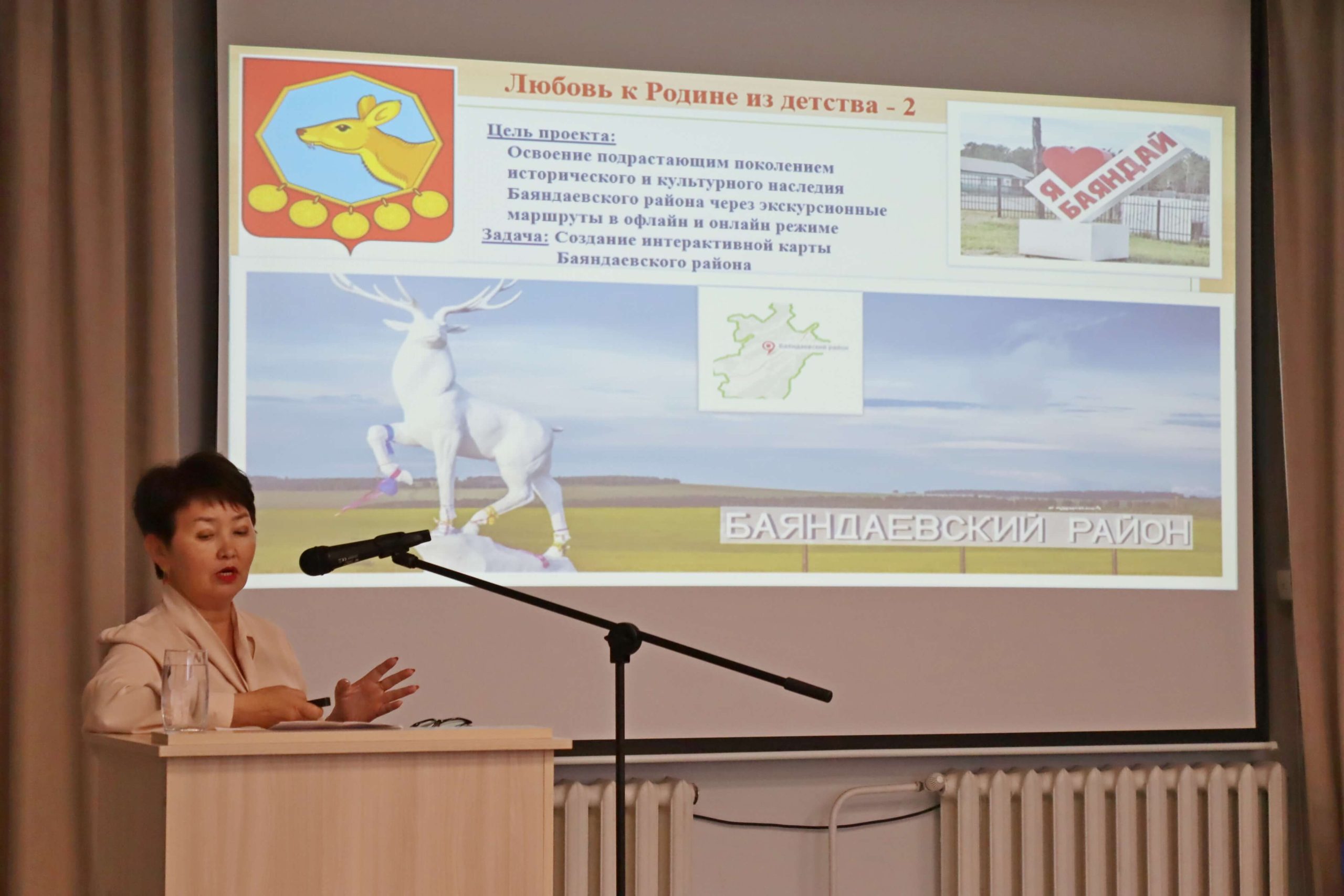 Завотделом по работе с детьми Межпоселенческой центральной библиотеки Баяндаевского района Энгельсина Буинова поделилась с участниками школы опытом реализации краеведческого проекта «Любовь к Родине». Проект направлен на решение задач краеведческого просвещения, вовлечения подрастающего поколения в процесс познания истории, культуры Баяндаевского района. Концепция проекта основана на создании интерактивной карты района, содержащей культурно-исторические объекты, памятники боевой и трудовой славы, культурные и природные достопримечательности района, истории об известных людях, рассказы об исторических событиях. Интерактивная карта размещена на сайте библиотеки. Эти сведения ребята находили в базе данных местной печати «Электронная память Баяндаевского района» (где собраны оцифрованные газетные статьи за несколько десятилетий), привозили из исследовательских поездок и экскурсий по району, собирали исторические сведения у старожилов. В рамках проекта дети участвовали в районных краеведческих чтениях «Моя семья в истории Баяндаевского района», в районной квест-игре «#Краевед87#МалаяРодина#Баяндай».