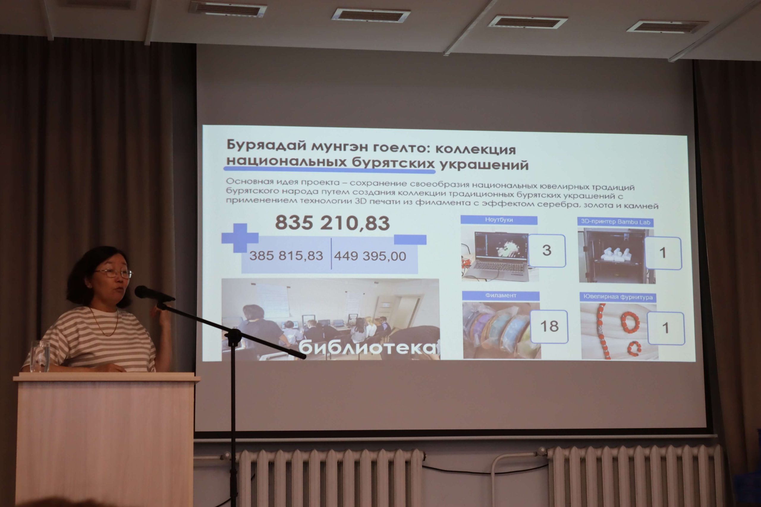 Заведующий Центральной детской библиотекой Межпоседенческой центральной библиотеки Аларского района им. А. В. Вампилова Валентина Раднаева рассказала об опыте реализации проекта «3D-Лаб: лаборатория архитекторов будущего». Проект нацелен на обретение знаний и развитие умений в области 3D-технологий у детей и подростков Аларского района и на сохранение ювелирных традиций бурятского народа. В рамках проекта на базе библиотеки Вампилова организовано инновационное пространство, где ребята сами создают национальные бурятские украшения. Всего в рамках проекта проведено около 200 мастер-классов для 50 ребят.