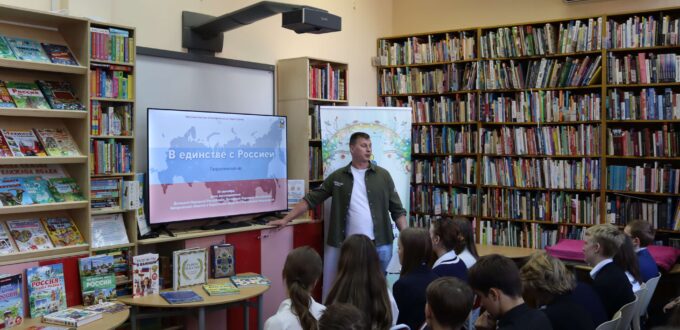 Три года назад жители Донбасса и Новороссии самостоятельно определили своё будущее на референдумах – быть со своим отечеством, с Россией. К этой важной дате в библиотеке прошла встреча старшеклассников с участником СВО, ветераном боевых действий, лектором Российского общества «Знание» Алексеем Лола.