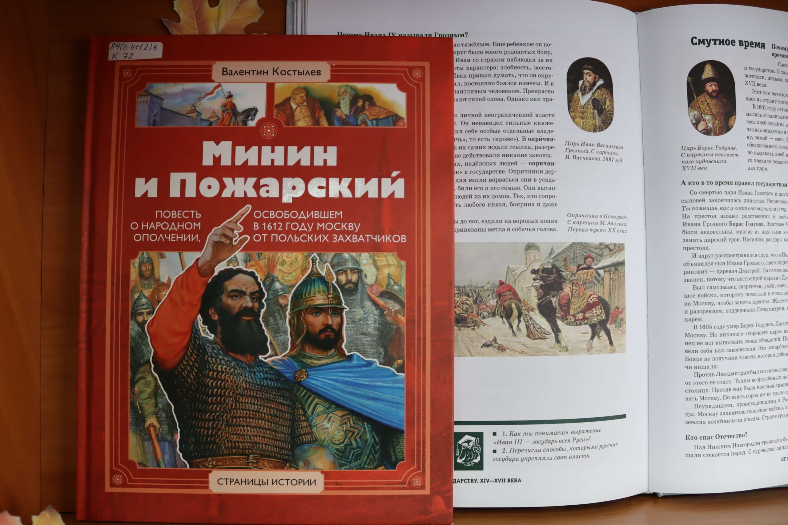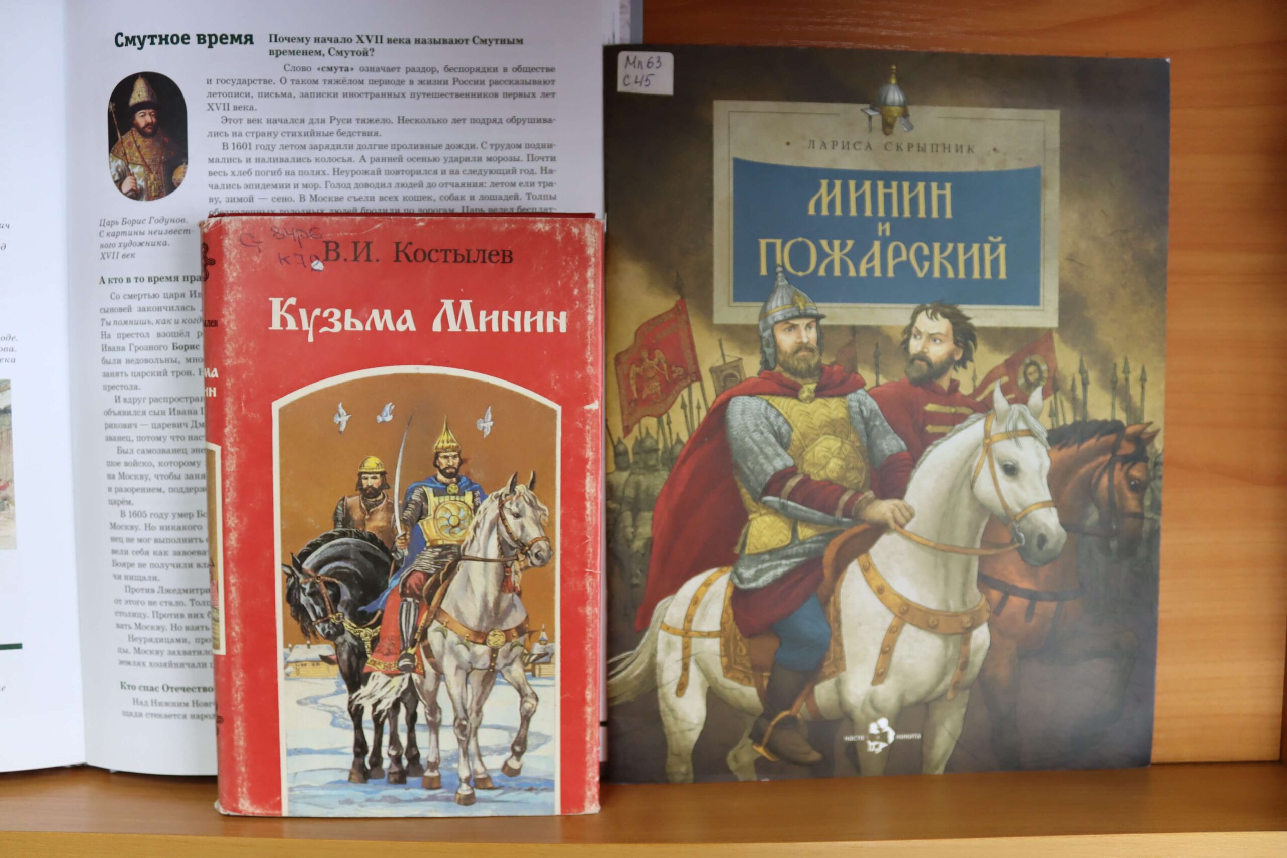В книге Ларисы Скрыпник «Минин и Пожарский» и одноименной книге Валентина Костылева подробно рассказывается о жизни и деятельности нижегородского земского старосты Кузьмы Минина и князя Дмитрия Пожарского, которые возглавили народное ополчение. Под их предводительством народное ополчение освободило в 1612 году Москву от польских захватчиков.