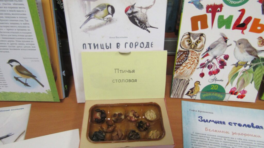 Обязательно привлечёт внимание читателей импровизированная кормушка, дополняющая выставку. Рассмотрев её содержимое, дети смогут лучше понять и запомнить, чем можно кормить птиц.