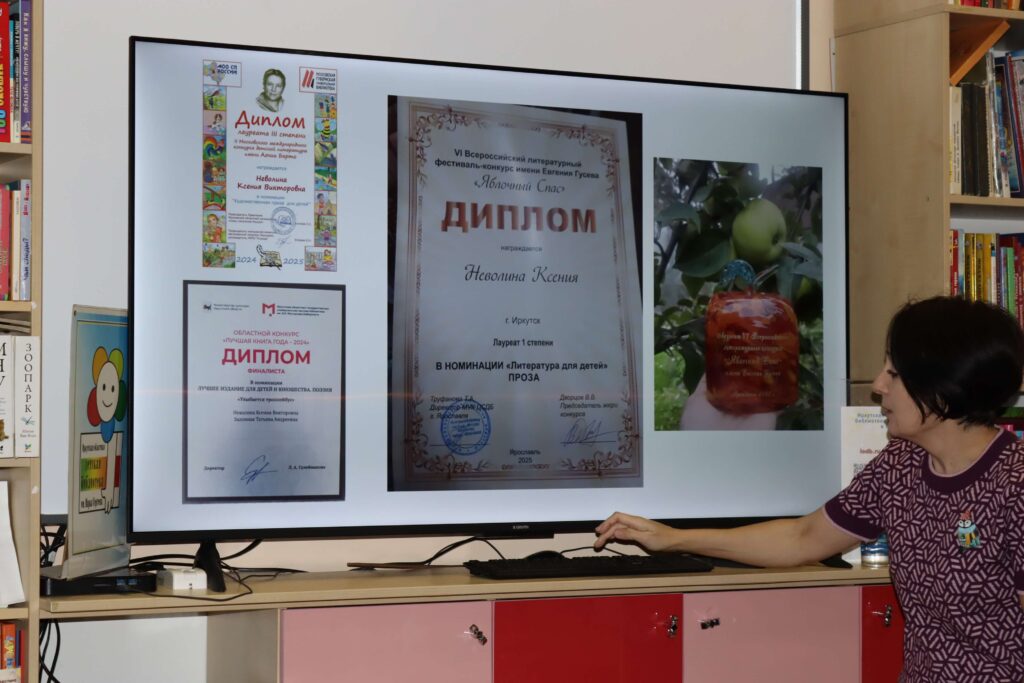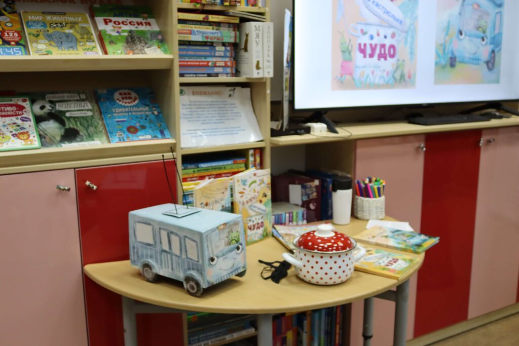 Писательница рассказала ребятам о своем творчестве и представила две свои книги. Это сборник весёлых и добрых стихов «Я варю в кастрюльке чудо», который стал победителем в областном конкурсе «Лучшая книга года – 2022», и сборник стихов и песенок для самых юных читателей – «Улыбается троллейбус» (2025). Привлекательные и динамичные иллюстрации в книгах сделаны московской художницей Таней Задояной.