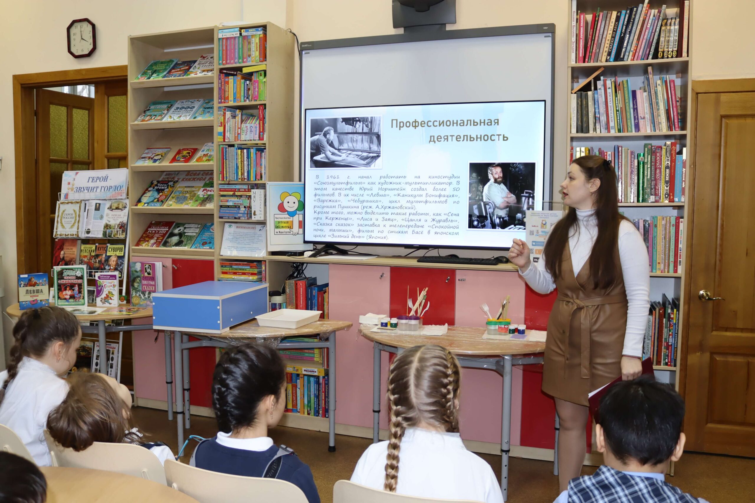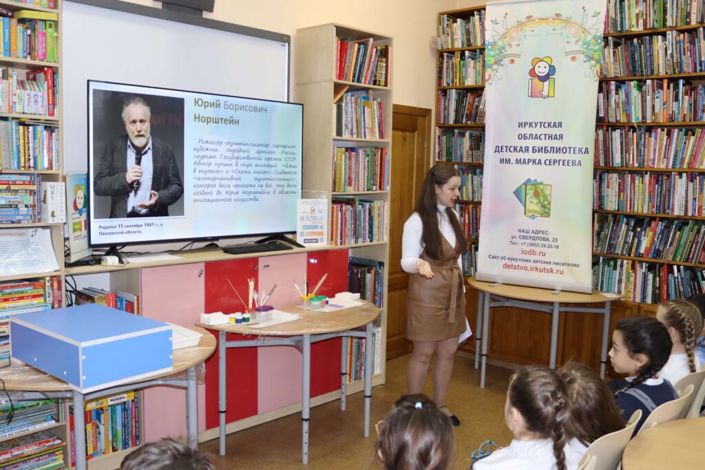 С помощью мультимедийной презентации библиотекарь познакомила детей с творчеством Юрия Борисовича Норштейна (род. в 1941 году), известного отечественного художника-мультипликатора, режиссёра и сценариста анимационного кино, народного артиста Российской Федерации (1996), лауреата Государственной премии СССР (1979). Работы режиссёра неоднократно получали престижные награды на фестивалях, признаны эталоном в искусстве анимации и стали мировой классикой.