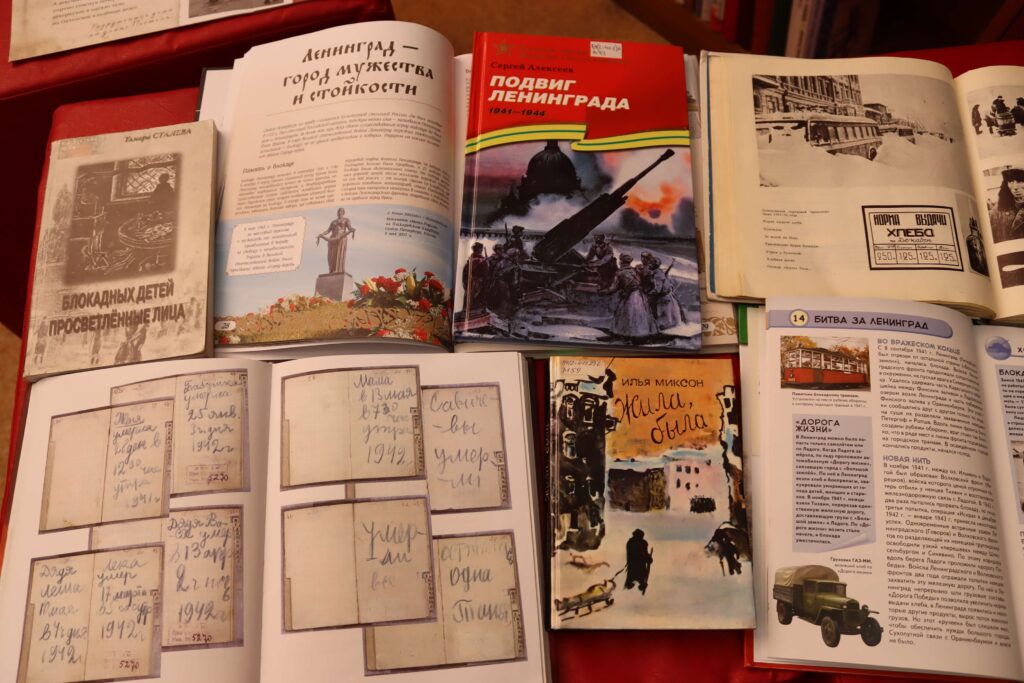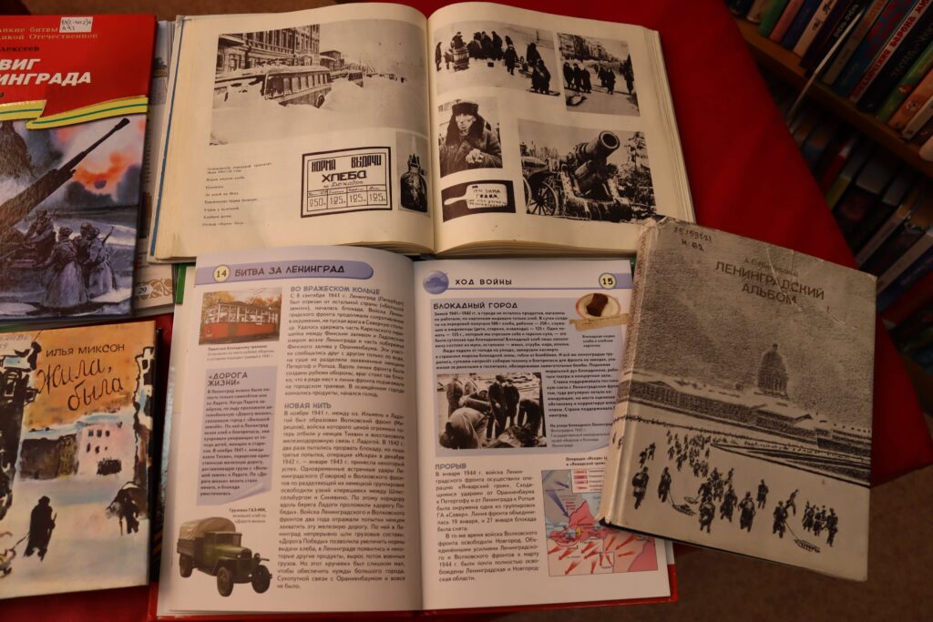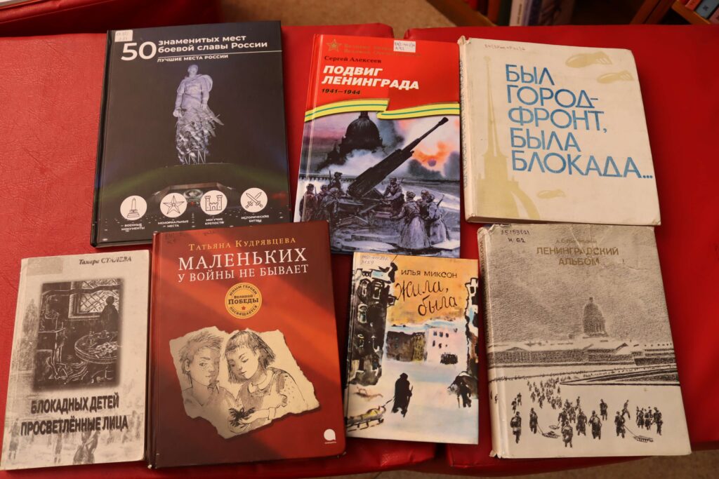 На также выставке представлены «50 знаменитых мест боевой славы России» Елены Лукомской, «Ленинградский альбом» Александра Никольского с рисунками, гравюрами и фотографиями блокадной фотохроники, сборник «Подвиг Ленинграда» детского писателя Сергея Алексеева, участника Великой Отечественной войны, и другие книги о непокоренном блокадном Ленинграде.