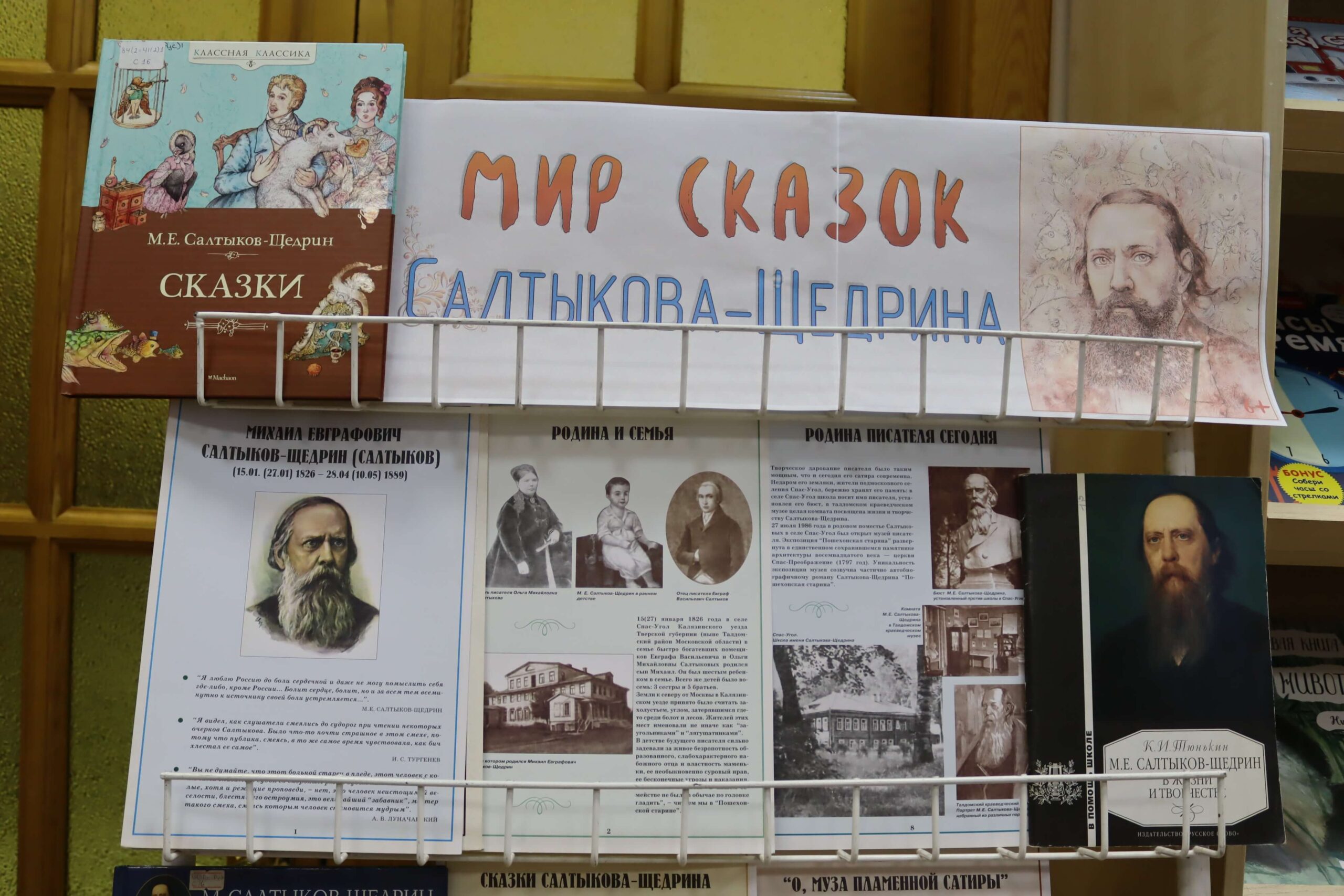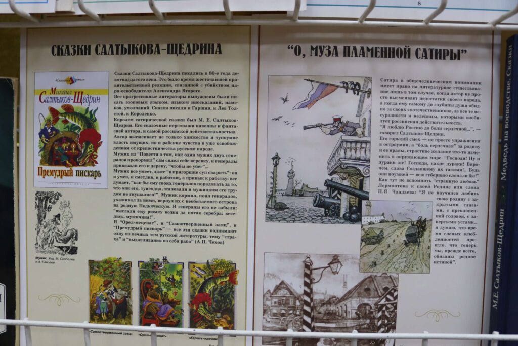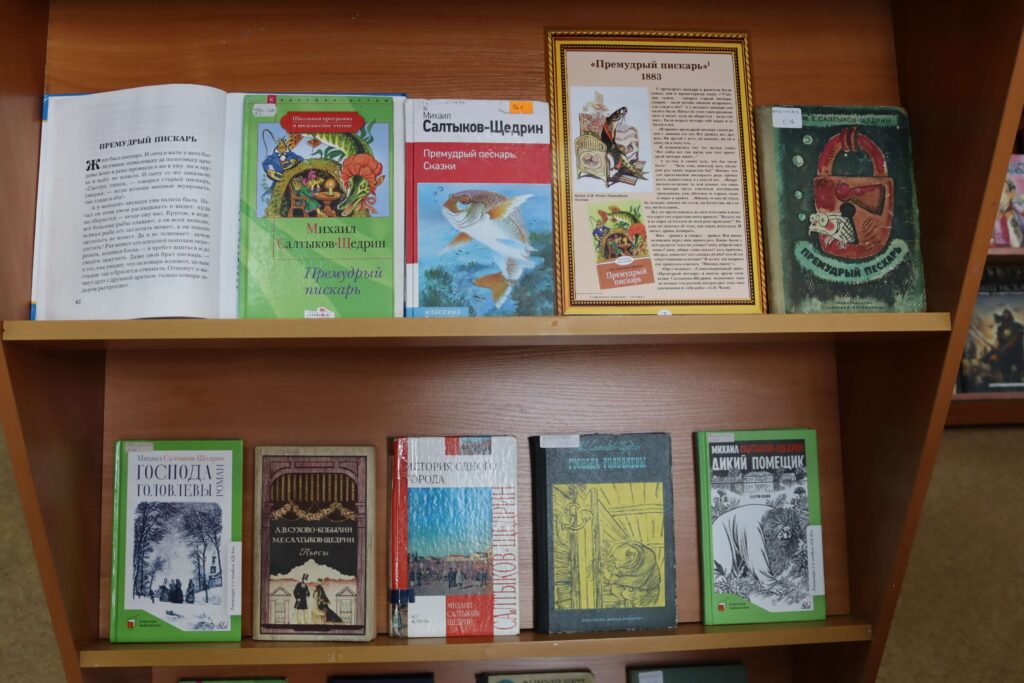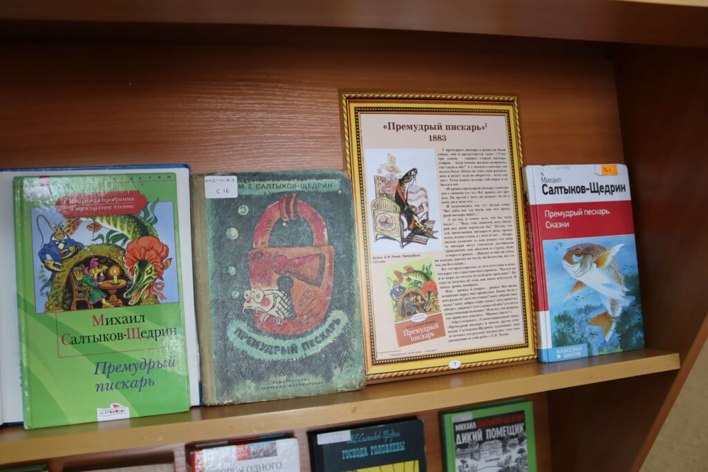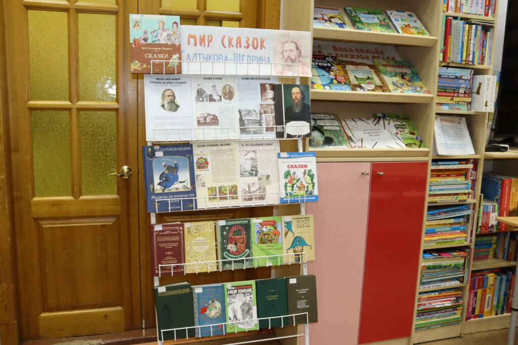 В отделах библиотеки развёрнуты книжно-иллюстративные выставки. На книжной выставке «Мир сказок Салтыкова-Щедрина» (6+) читатели найдут литературу о жизненном пути писателя, его родителях, детских и юношеских годах. Кроме того, здесь представлены исследования литературоведов об особенностях его творчества и сатирической эстетики, об историко-философском содержании его произведений, а также ключевые произведения писателя – известные романы, повести и очерки.
