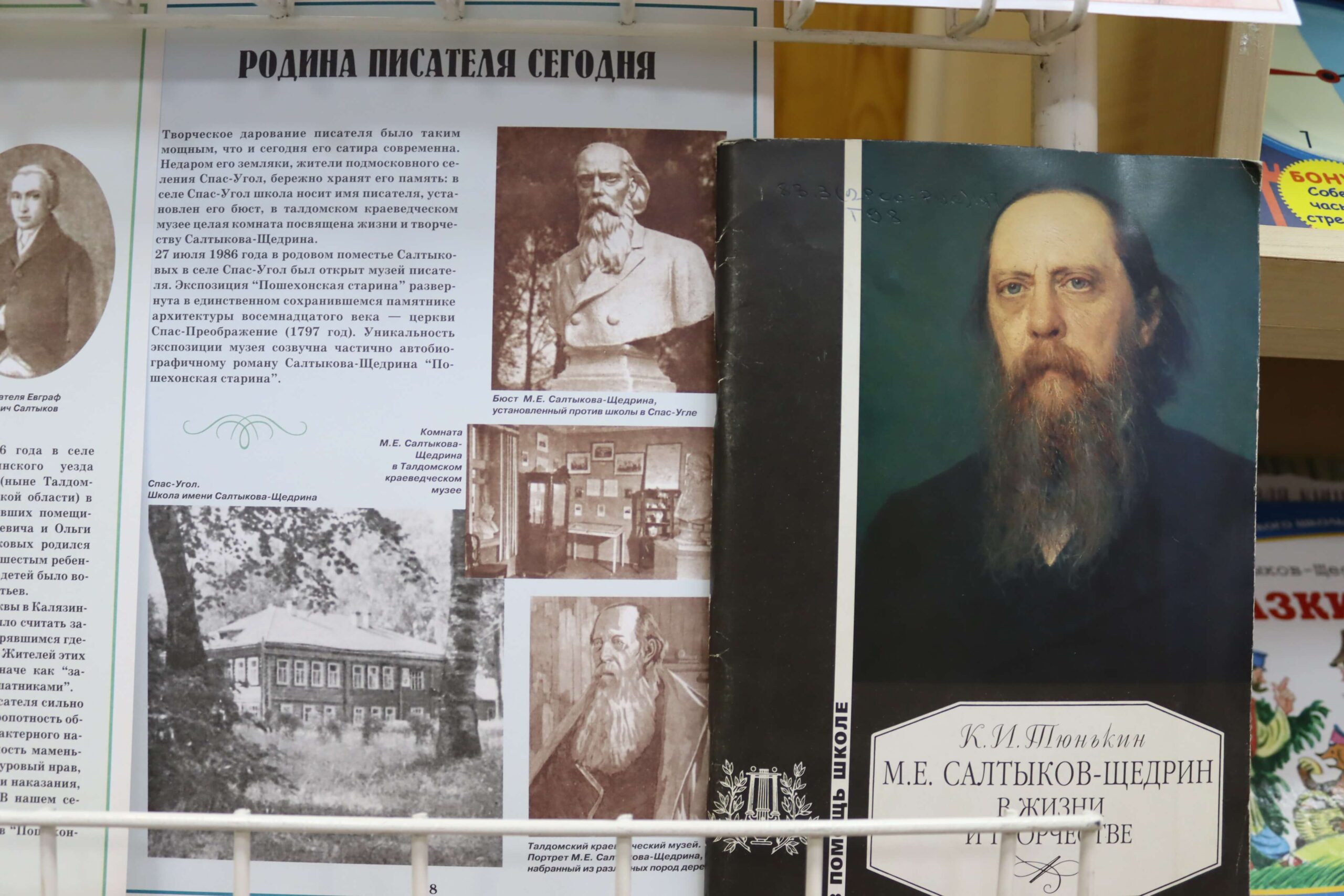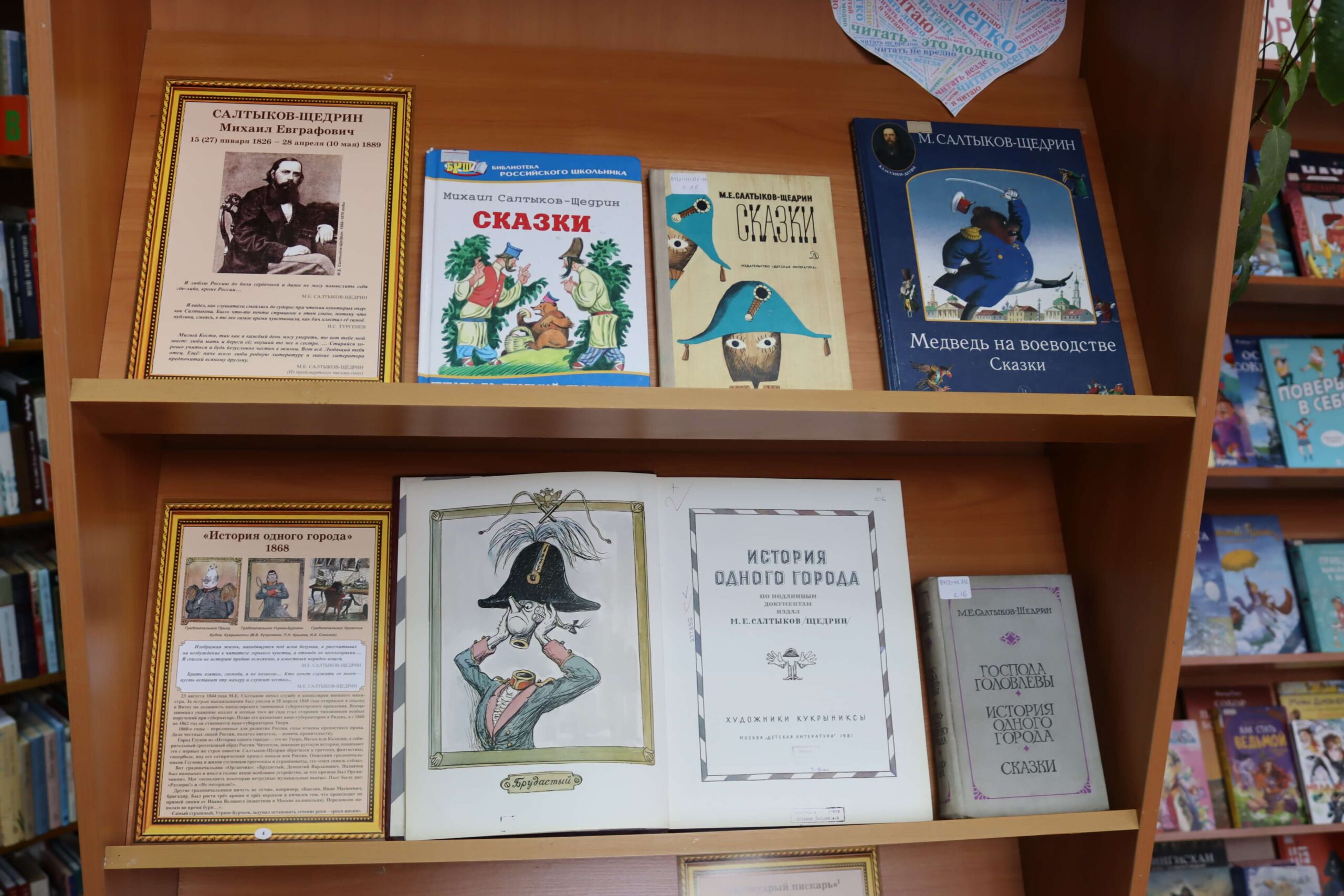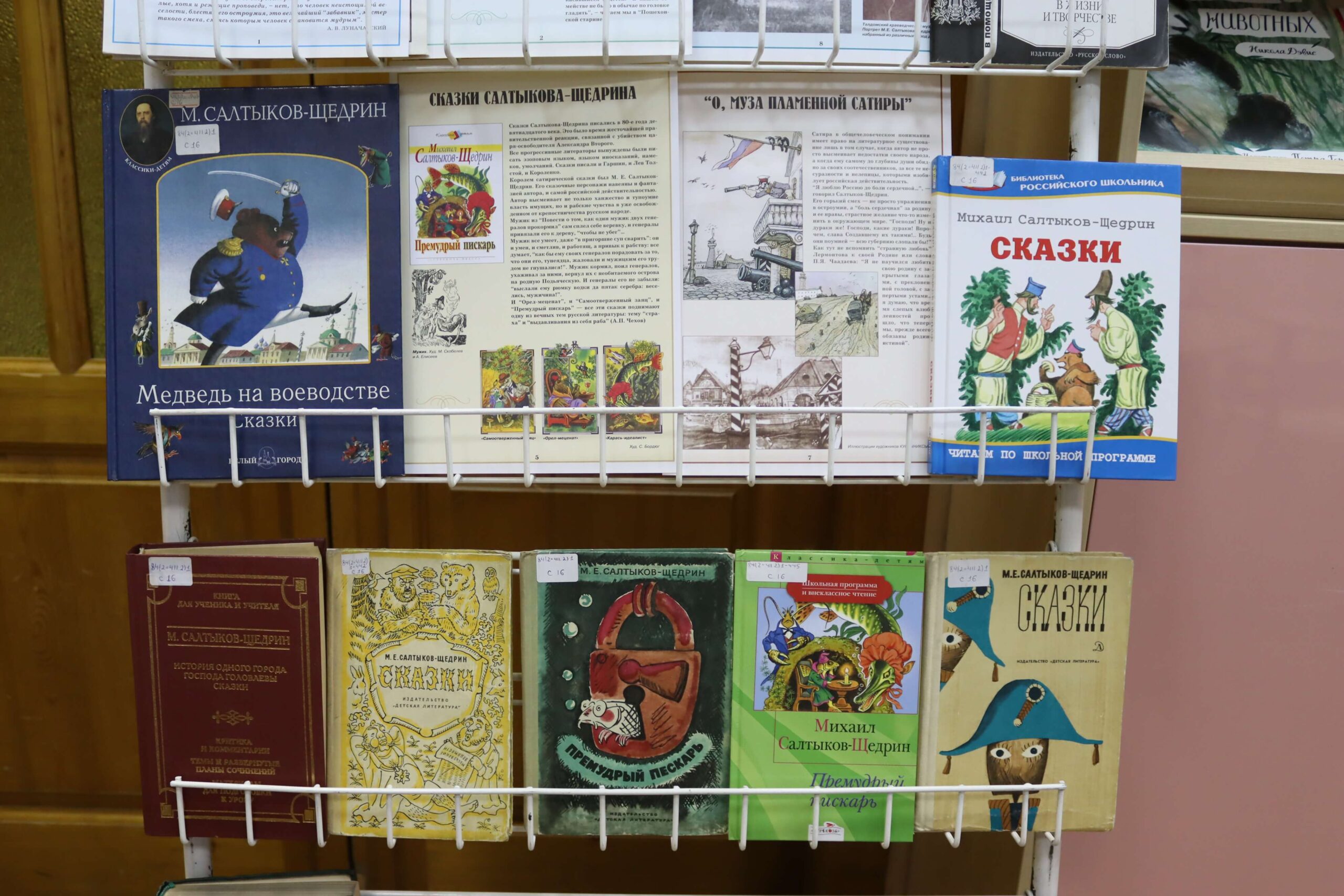 В отделах библиотеки развёрнуты книжно-иллюстративные выставки. На книжной выставке «Мир сказок Салтыкова-Щедрина» (6+) читатели найдут литературу о жизненном пути писателя, его родителях, детских и юношеских годах. Кроме того, здесь представлены исследования литературоведов об особенностях его творчества и сатирической эстетики, об историко-философском содержании его произведений, а также ключевые произведения писателя – известные романы, повести и очерки.