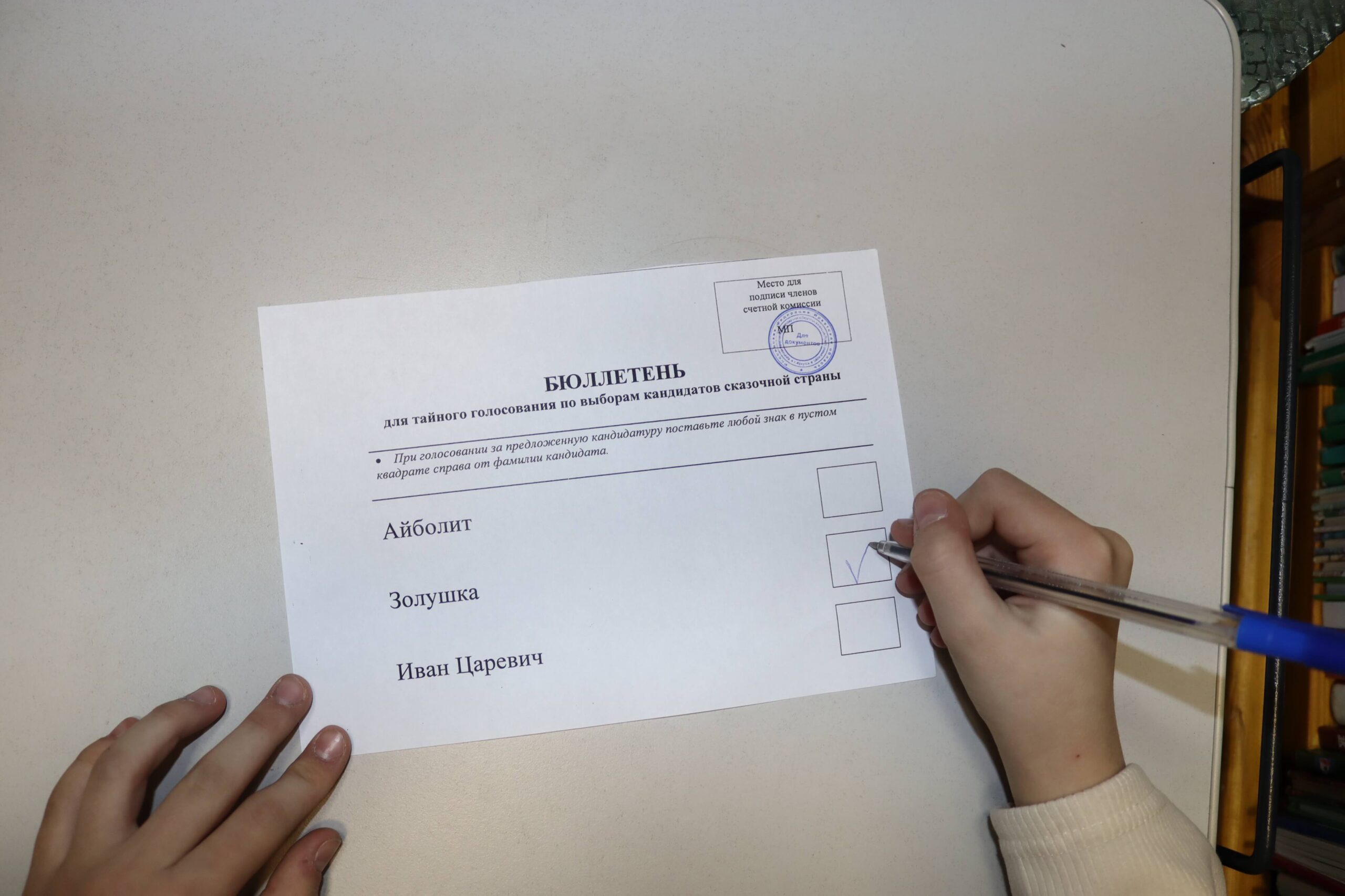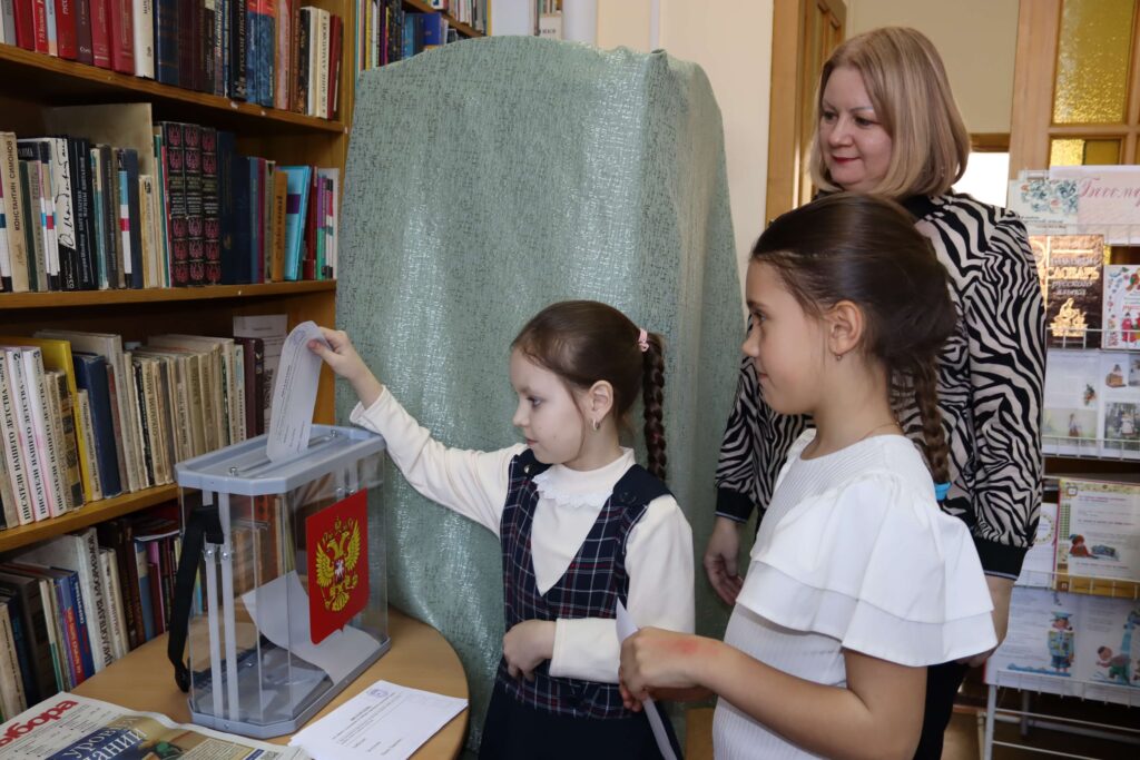 Все дети получили по экземпляру избирательного бюллетеня и, зайдя в кабинку для голосования, ставили «галочку» возле, на их взгляд, самого достойного кандидата. Затем по очереди опускали свои бюллетени в опечатанную настоящую урну для голосования, которую принесла на мероприятие Марина Безвербная.