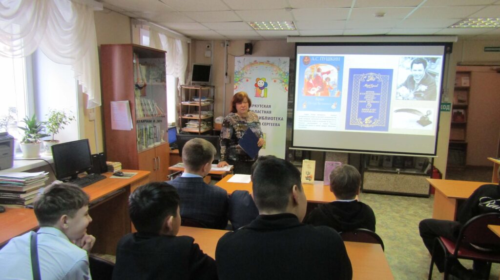 Для читателей среднего школьного возраста в отделе краеведения и библиографии Иркутской областной детской библиотеки им. Марка Сергеева прошёл литературно-исторический час «”Перо поэта”: тема Пушкина в творчестве Марка Сергеева».