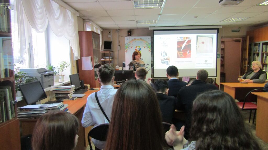 Особый интерес у школьников вызвал рассказ библиотекаря о книге Марка Сергеева «Перо поэта». В своём историческом повествовании он рассказал, как подлинное перо А.С. Пушкина, похищенное с его стола в 1837 году, через сто лет обнаружилось в Иркутске, а затем оказалось в Москве в музее Пушкина. Школьники узнали, что прежде чем написать документальную повесть, Марк Сергеев провёл большую исследовательскую работу.