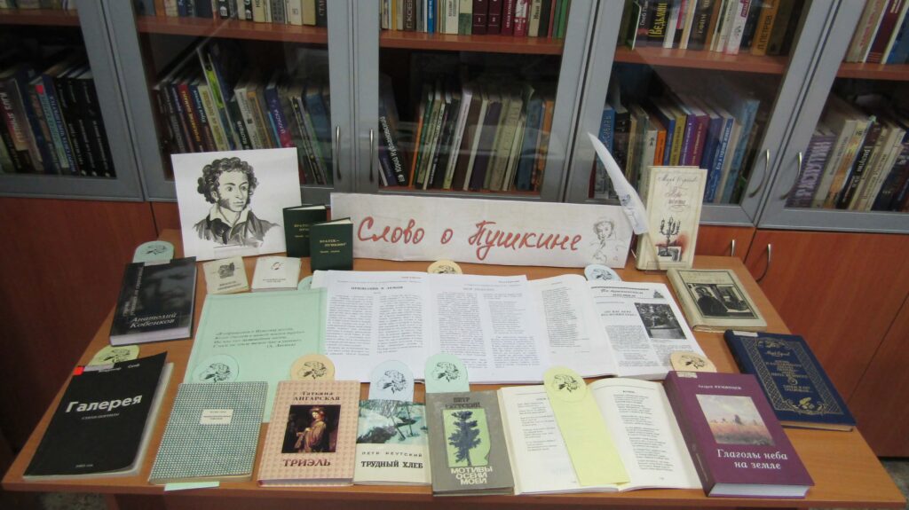 В завершение встречи ребята ознакомились с небольшой книжной выставкой «Слово о Пушкине». Там были представлены произведения Марка Сергеева и сборники поэтов Прибайкалья, коснувшихся в своём творчестве пушкинской темы. Среди них стихи Петра Реутского, Владимира Скифа, Анатолия Кобенкова, Татьяны Суровцевой и Татьяны Ангарской.