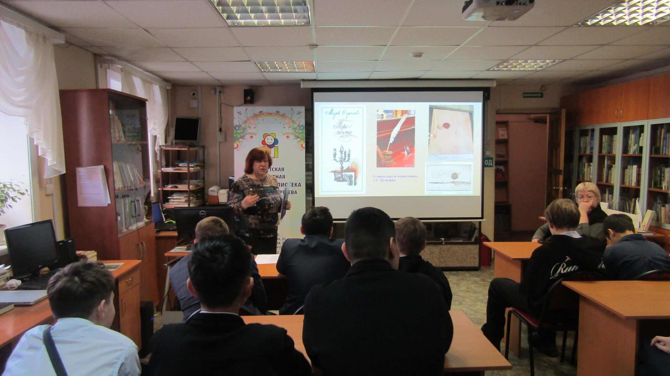 Особый интерес у школьников вызвал рассказ библиотекаря о книге Марка Сергеева «Перо поэта». В своём историческом повествовании он рассказал, как подлинное перо А.С. Пушкина, похищенное с его стола в 1837 году, через сто лет обнаружилось в Иркутске, а затем оказалось в Москве в музее Пушкина. Школьники узнали, что прежде чем написать документальную повесть, Марк Сергеев провёл большую исследовательскую работу.