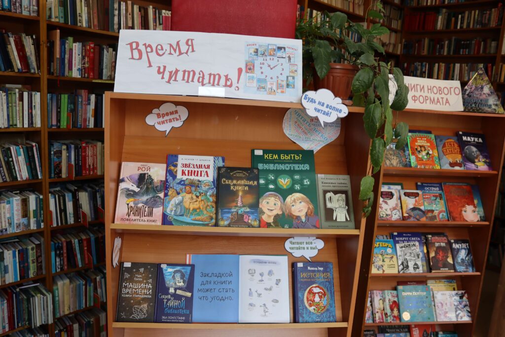 Книжная выставка «Время читать» (12+) развёрнута в отделе обслуживания читателей 10–15 лет. В экспозиции представлена литература для детей и подростков, охватывающая широкий спектр жанров – от приключенческой прозы и фэнтези до занимательных школьных историй, научпопа и комиксов.