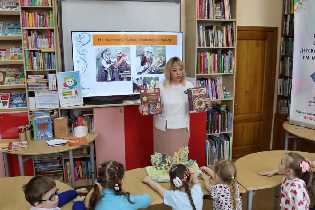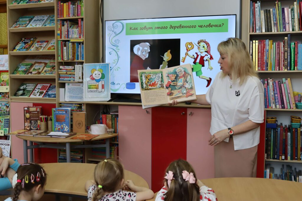 Дошкольники вспомнили героев повести-сказки Алексея Толстого «Золотой ключик, или Приключения Буратино» (1936), которой в этом году исполняется 90 лет. Большой интерес у ребят вызвала книжка-панорамка с объёмными иллюстрациями известного художника Леонида Владимирского.
