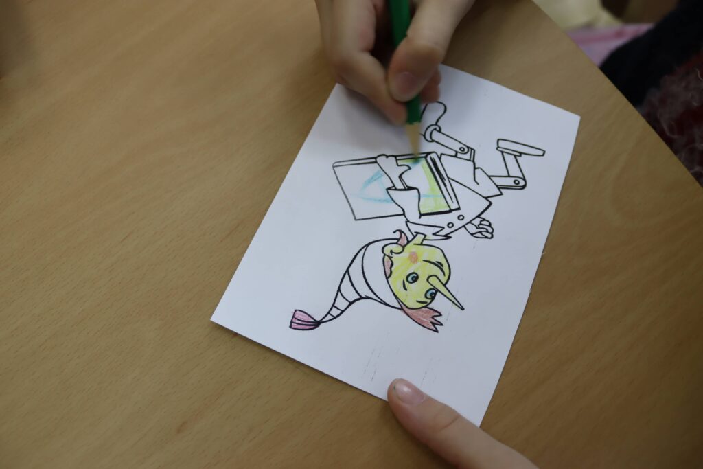 Встреча завершилась творческими заданиями, которое помогло ребятам проявить свои способности. Дети сделали аппликацию по эскизу, на котором изображён Буратино. Они старательно раскрасили картинку и наклеили карандашную стружку и звёздочки-украшения.