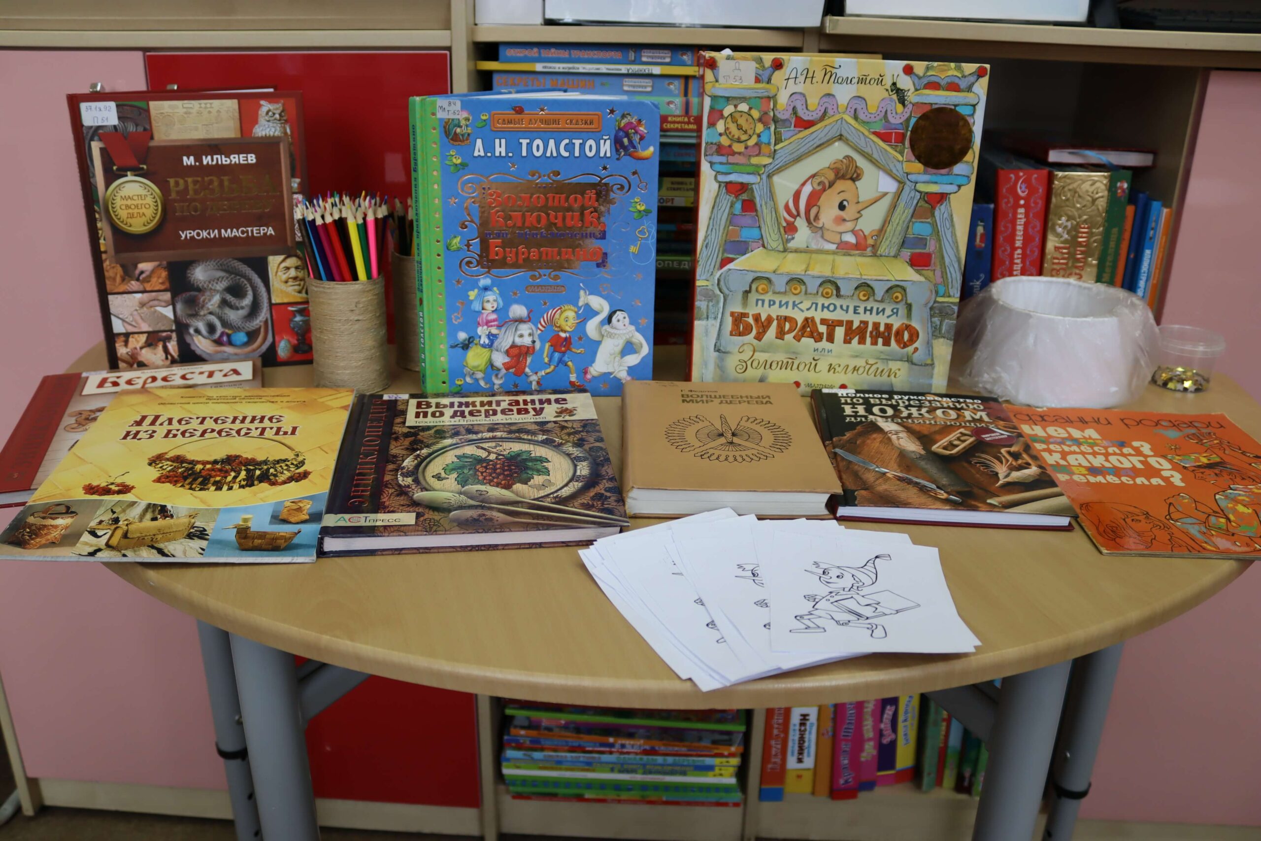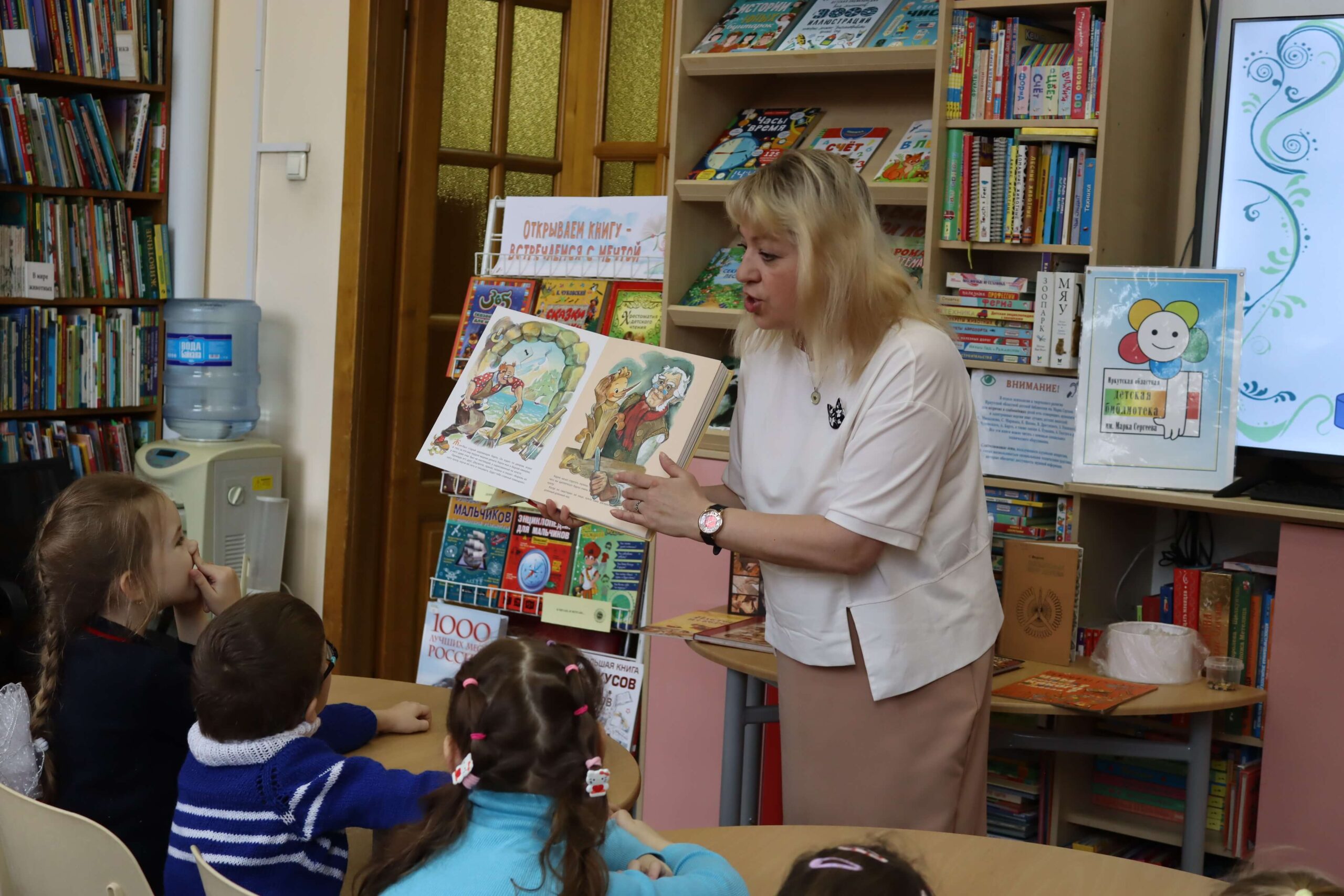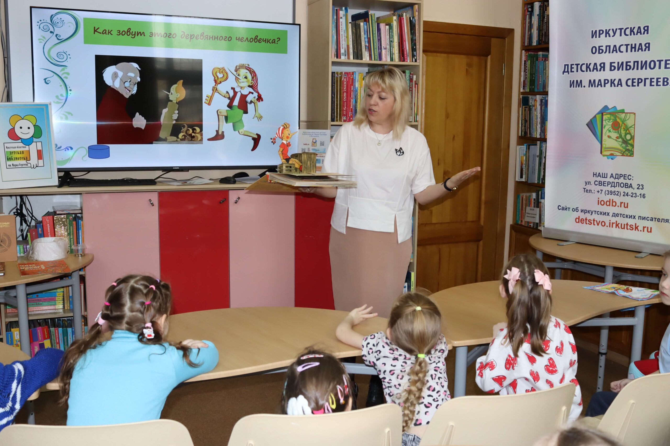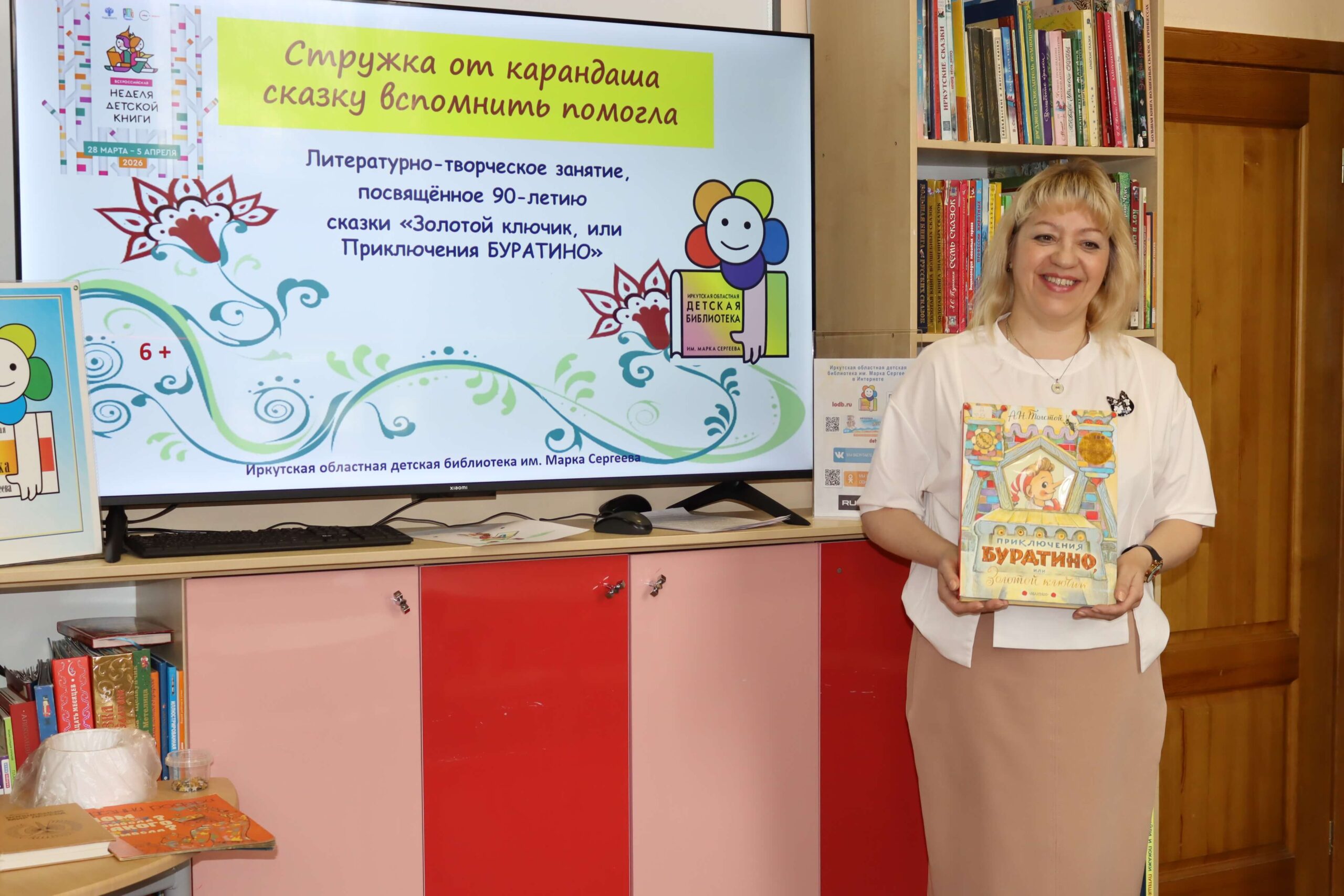 Дошкольники вспомнили героев повести-сказки Алексея Толстого «Золотой ключик, или Приключения Буратино» (1936), которой в этом году исполняется 90 лет. Большой интерес у ребят вызвала книжка-панорамка с объёмными иллюстрациями известного художника Леонида Владимирского.