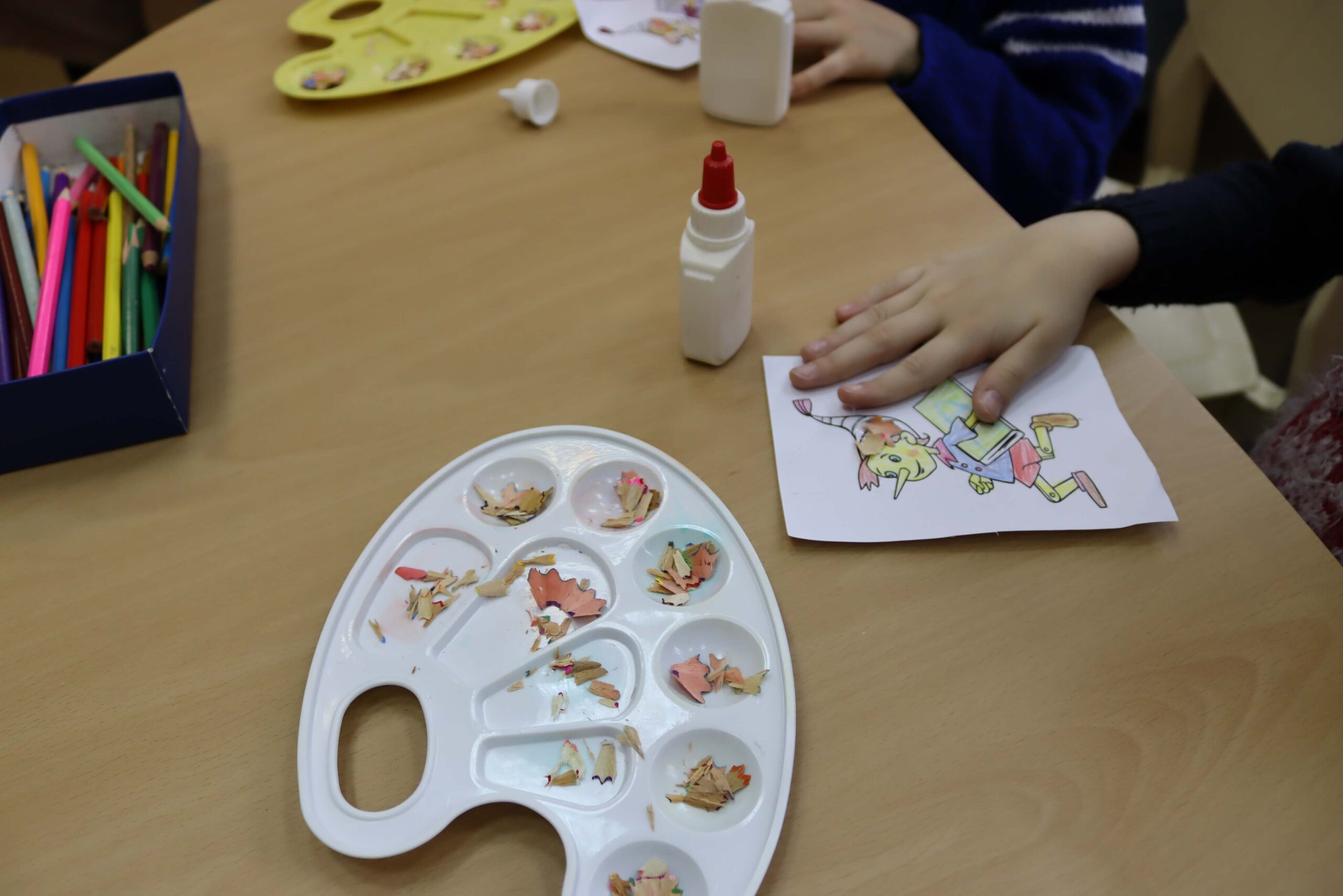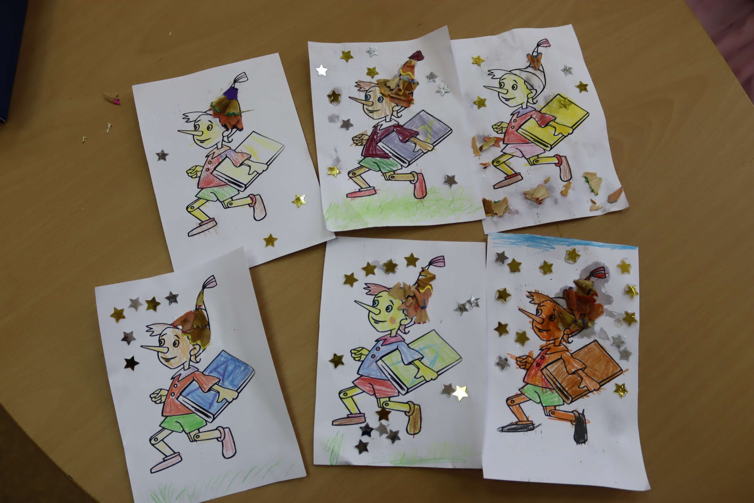 Встреча завершилась творческими заданиями, которое помогло ребятам проявить свои способности. Дети сделали аппликацию по эскизу, на котором изображён Буратино. Они старательно раскрасили картинку и наклеили карандашную стружку и звёздочки-украшения.