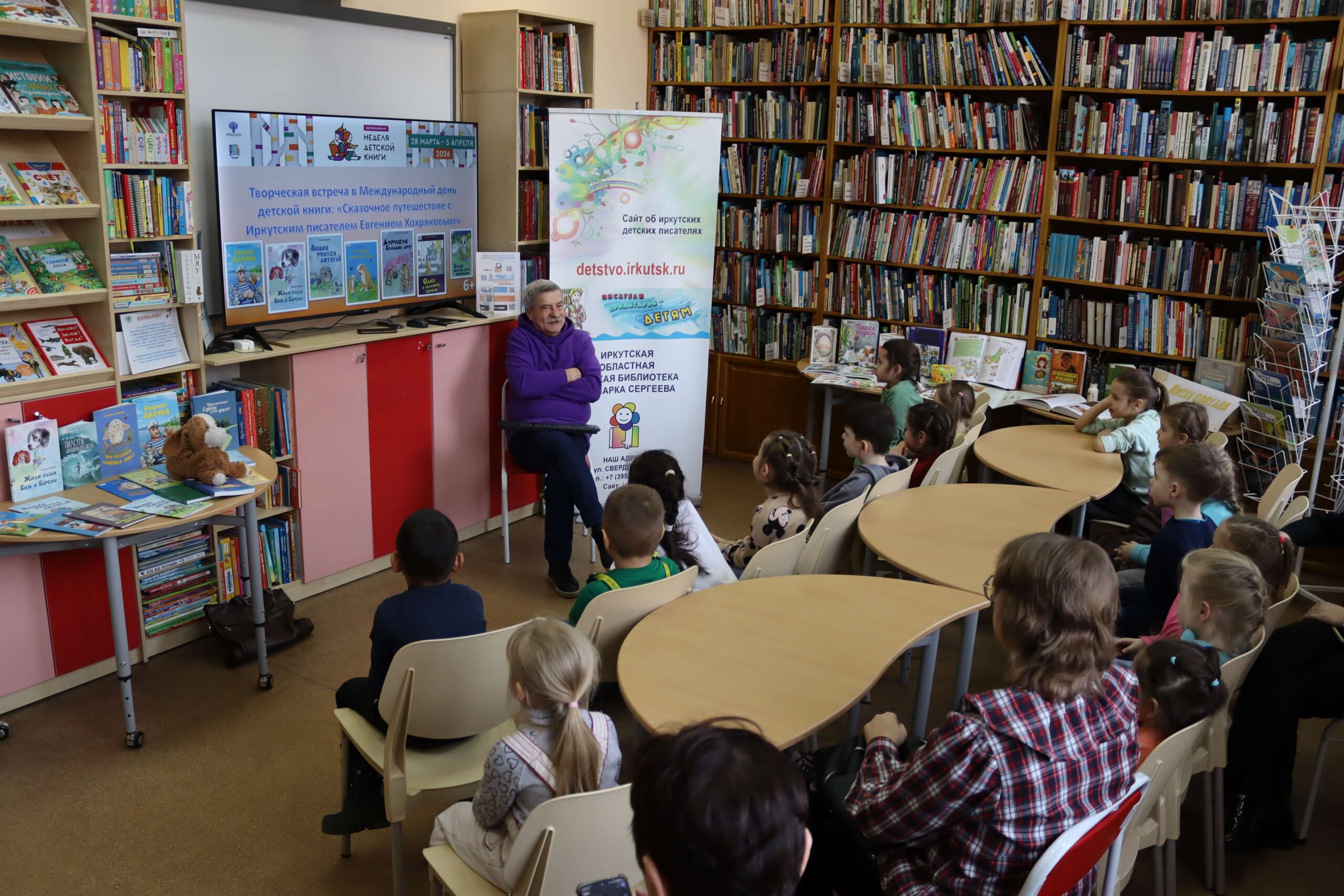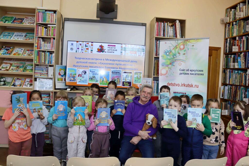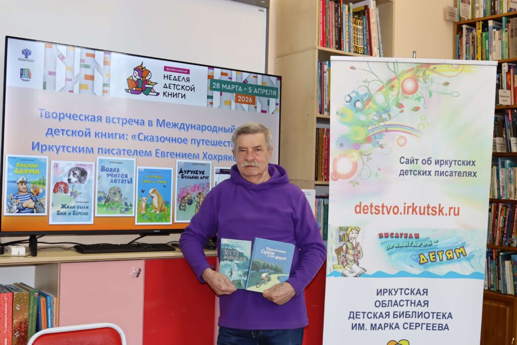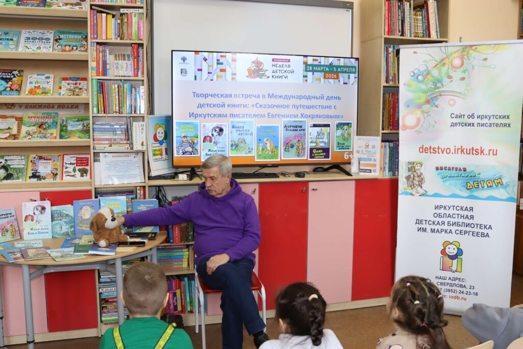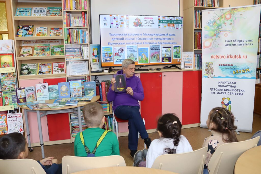 В дни Недели детской книги – 2026 для самых юных читателей и их родителей в Иркутской областной детской библиотеке им. Марка Сергеева 2 апреля прошла творческая встреча «Сказочное путешествие с иркутским писателем Евгением Хохряковым».