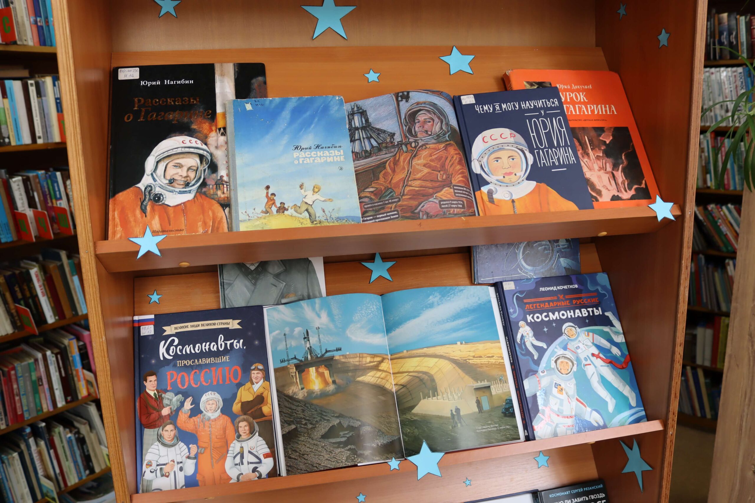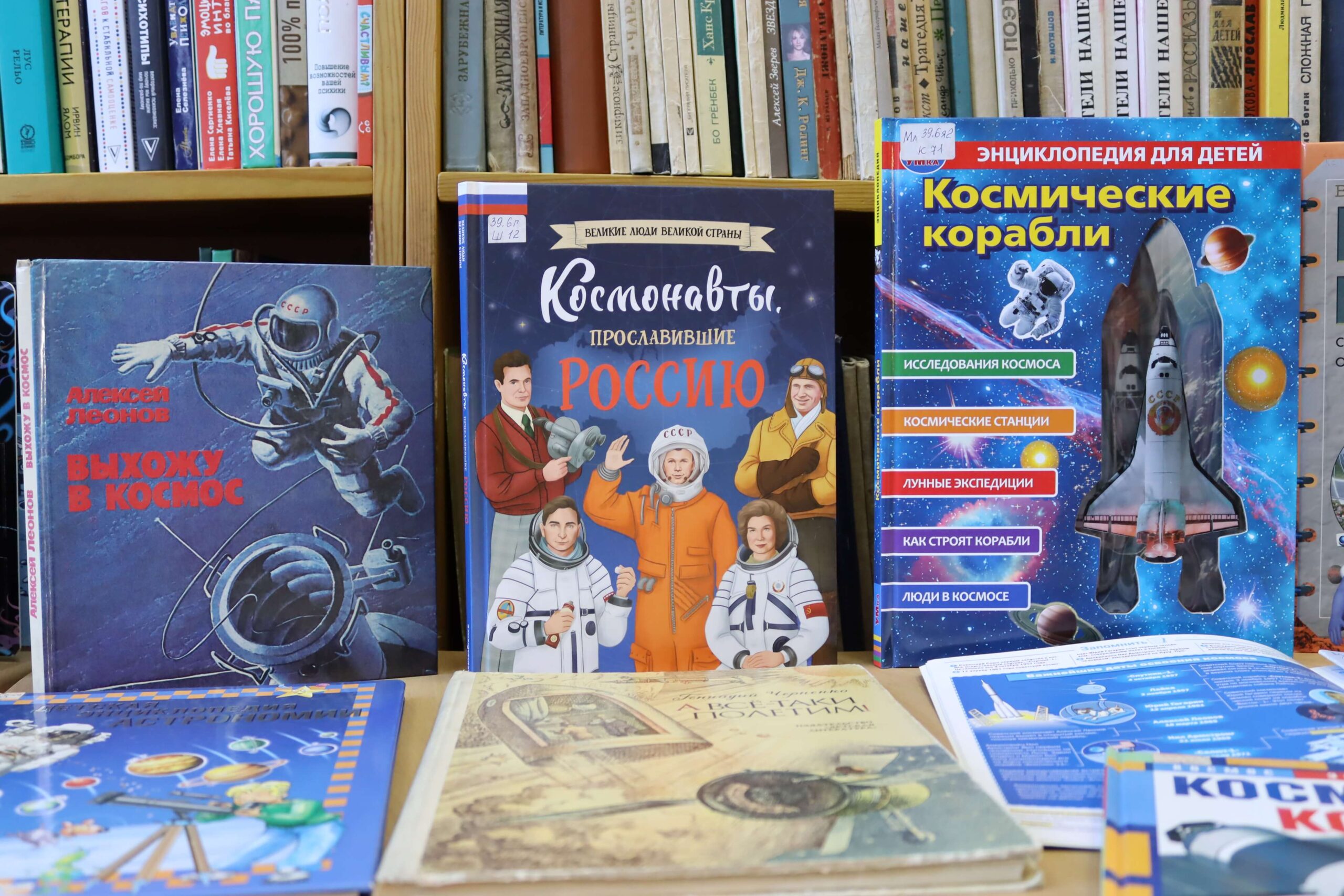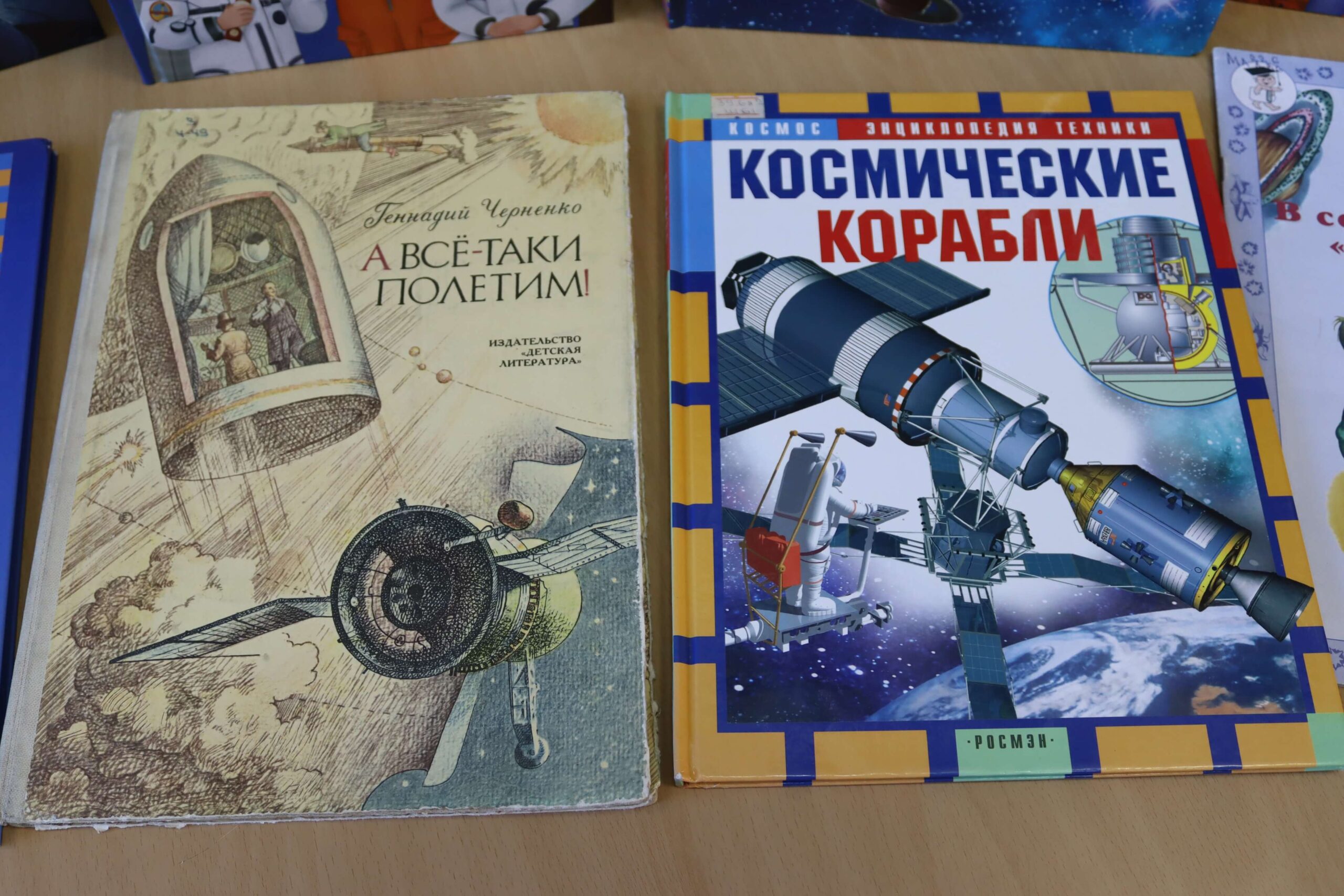 Также на выставке можно найти книги «Первые покорители космоса», «А всё-таки полетим», «Профессия космонавт» и многие другие.