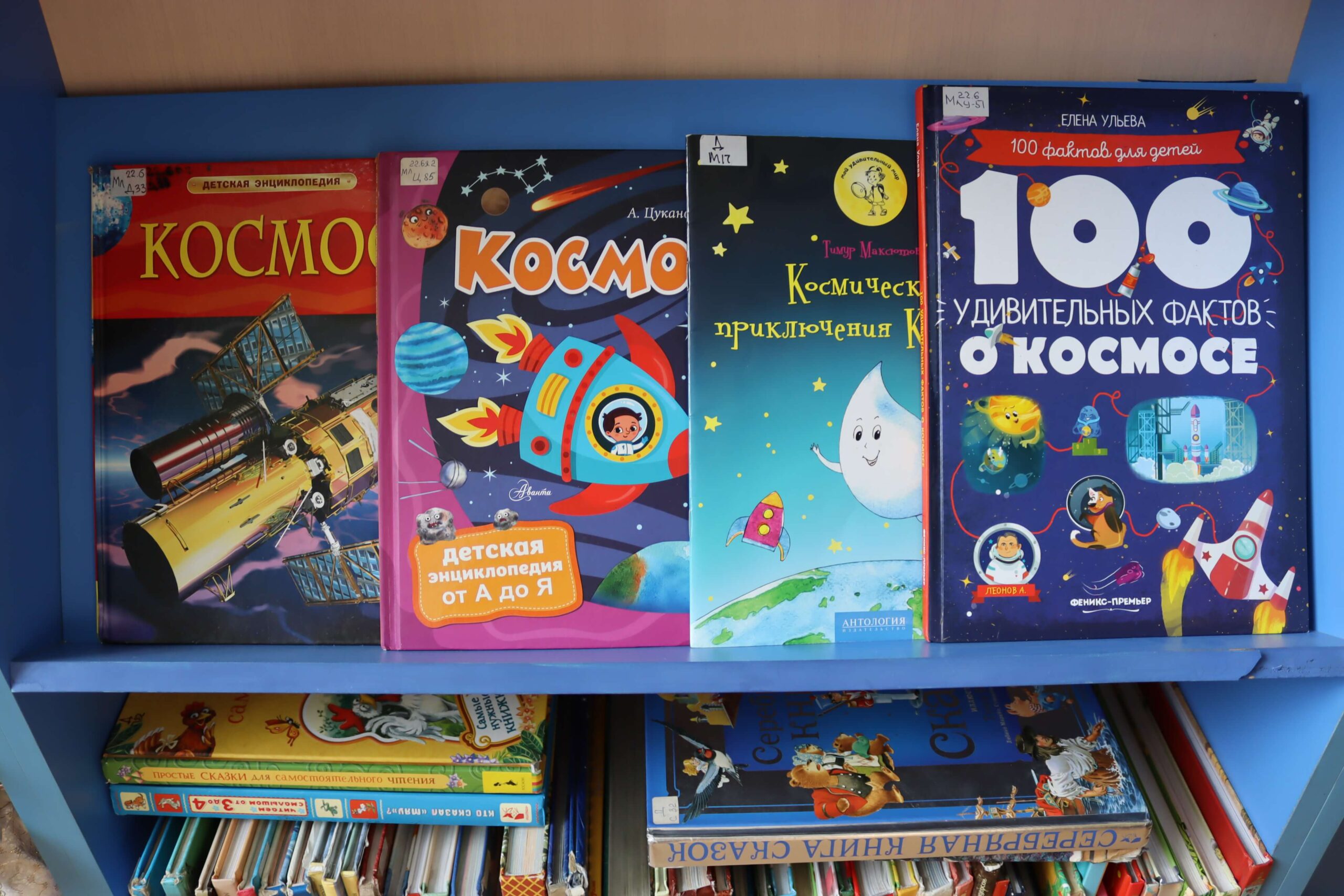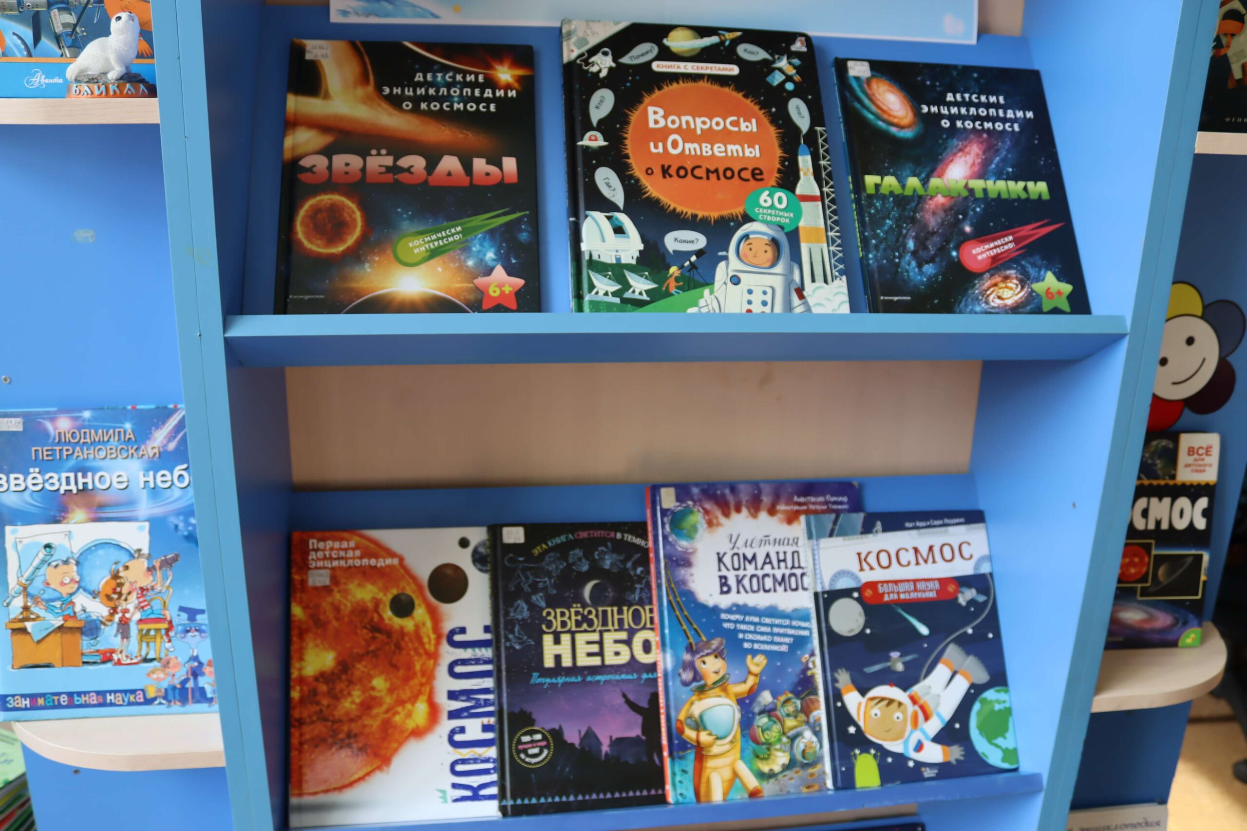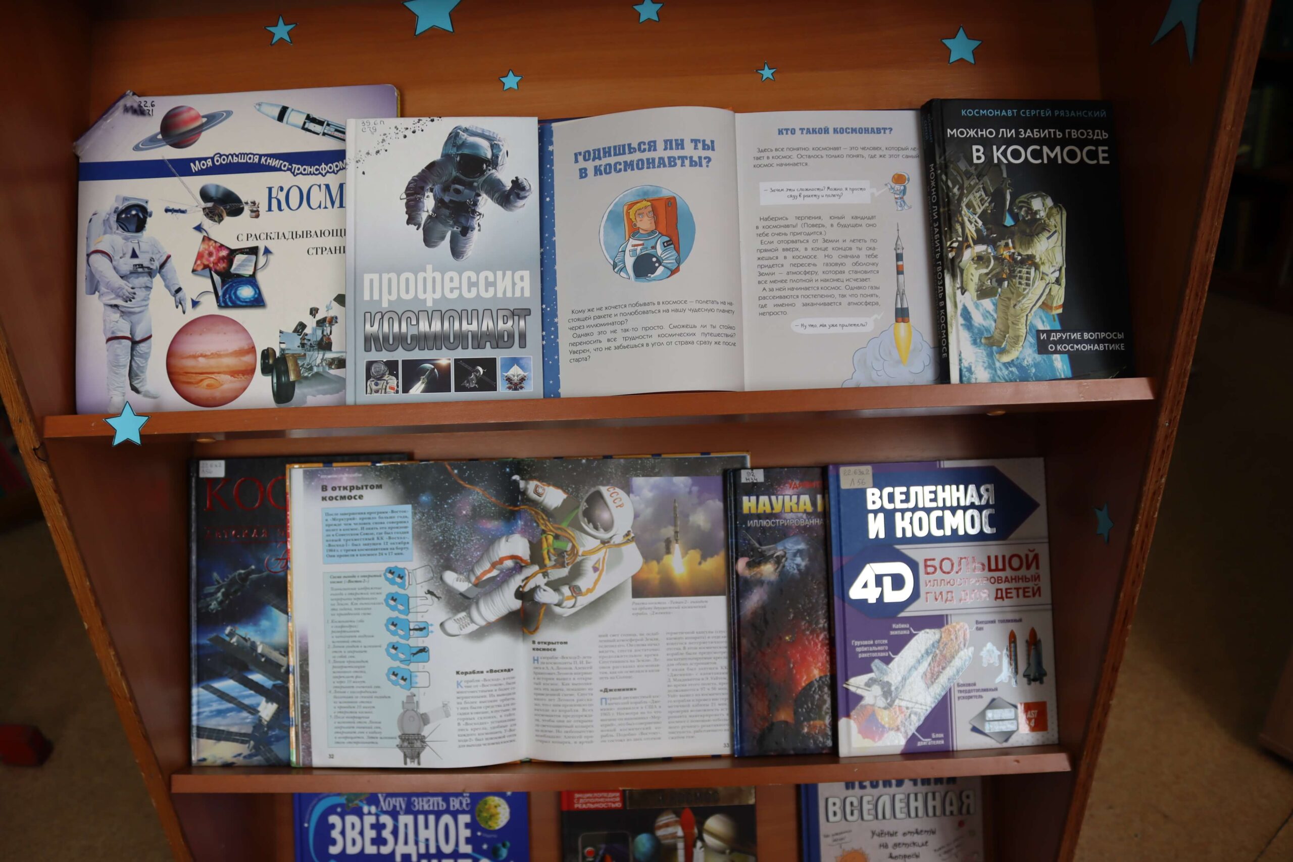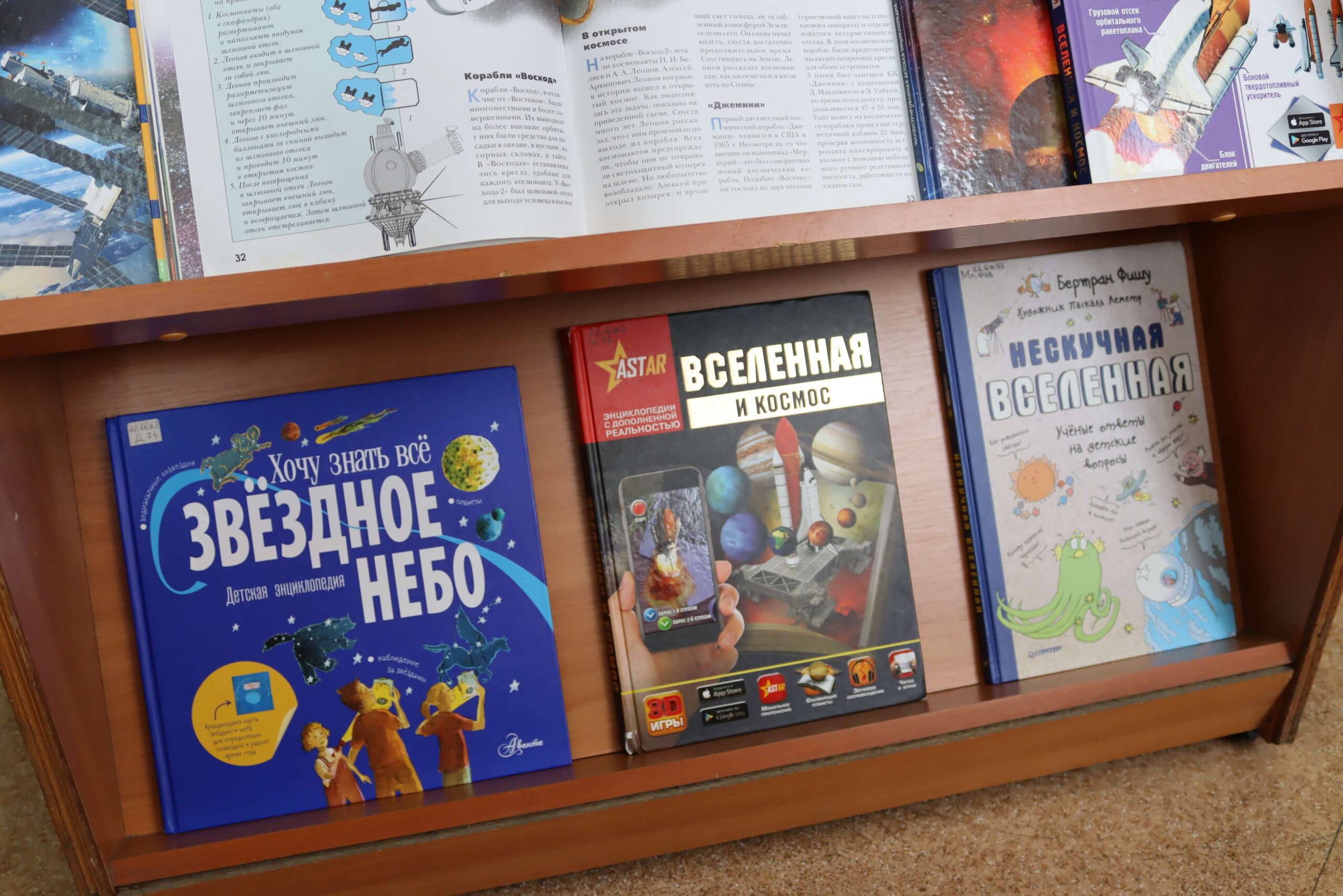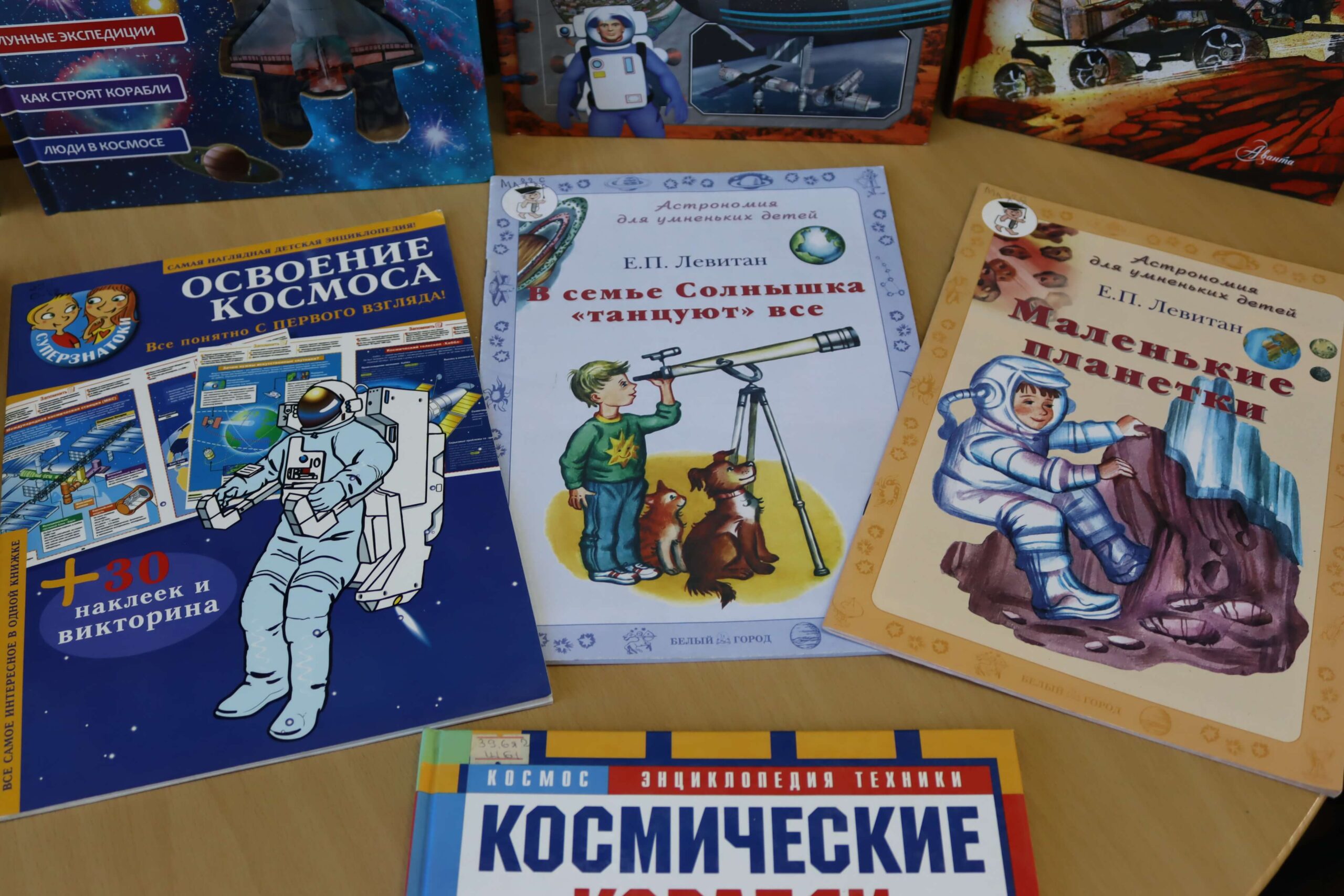 Также на выставке представлены книги о космосе, звёздах, планетах, солнечной системе, космических спутниках, станциях, лунном автомобиле и пушистых космонавтах: «Космос» Алеси Третьяковой и Вячеслава Ликсо, «Детская энциклопедия астрономии» Александра Вайнберга «Детская энциклопедия космоса» Джона Фарндона, книга из серии «Астрономия для умненьких детей» Ефрема Левитана и книга-раскладушка «Книга с секретами. Тайны космоса для детей и взрослых» издательства «Робинс», «Почему космос черный?» Василия Аверкиева, «Звездное небо: детская энциклопедия» Майкла Дрисколла, «Секреты космоса: 70 секретных створок» Р.Л. Джойса и другие издания.