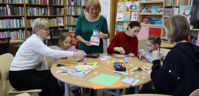 В День учителя дети и их родители под руководством библиотекаря делали поздравительные открытки из цветной бумаги в технике скрапбукинг.