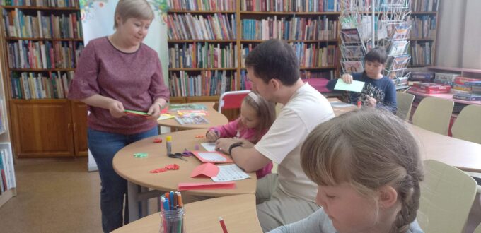 В замечательный праздник День отца дети с родителями под руководством библиотекаря делали объёмные открытки из цветной бумаги для дорогих и любимых пап.